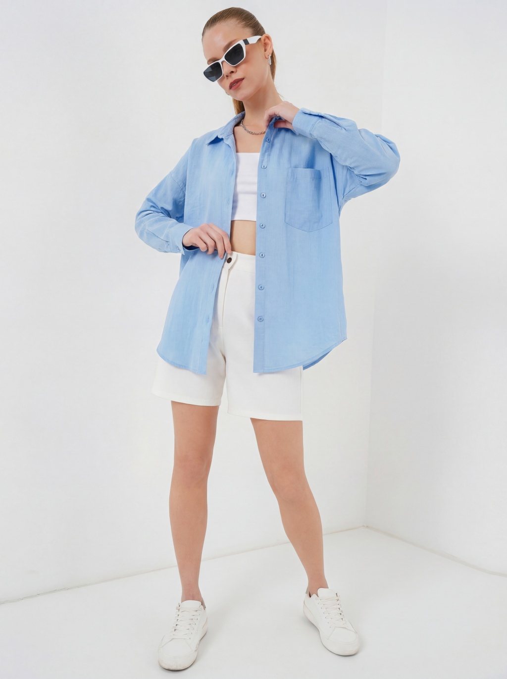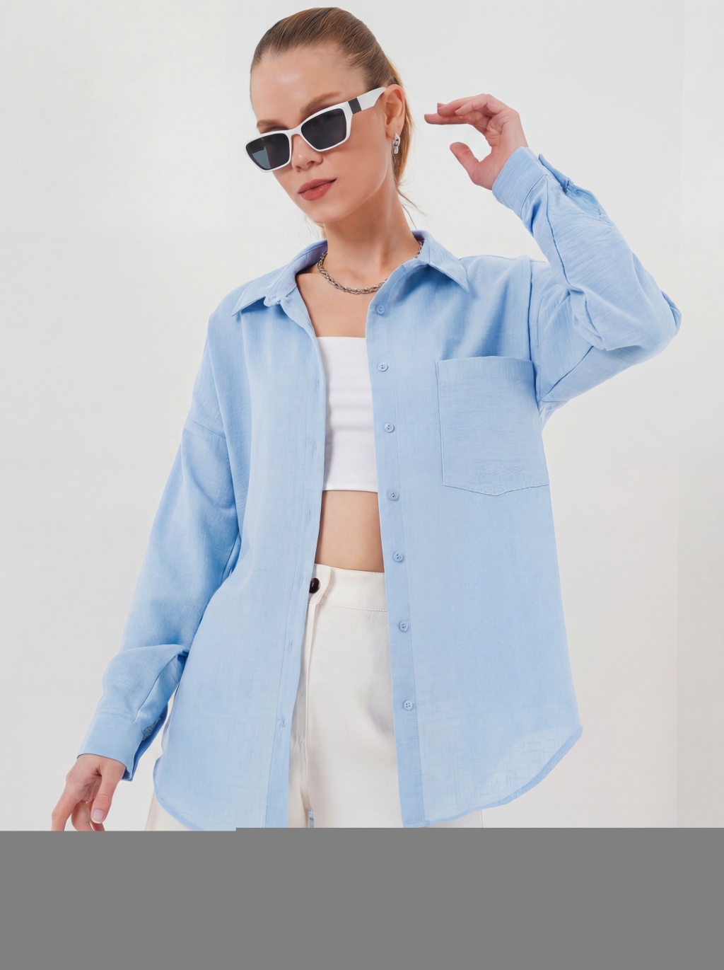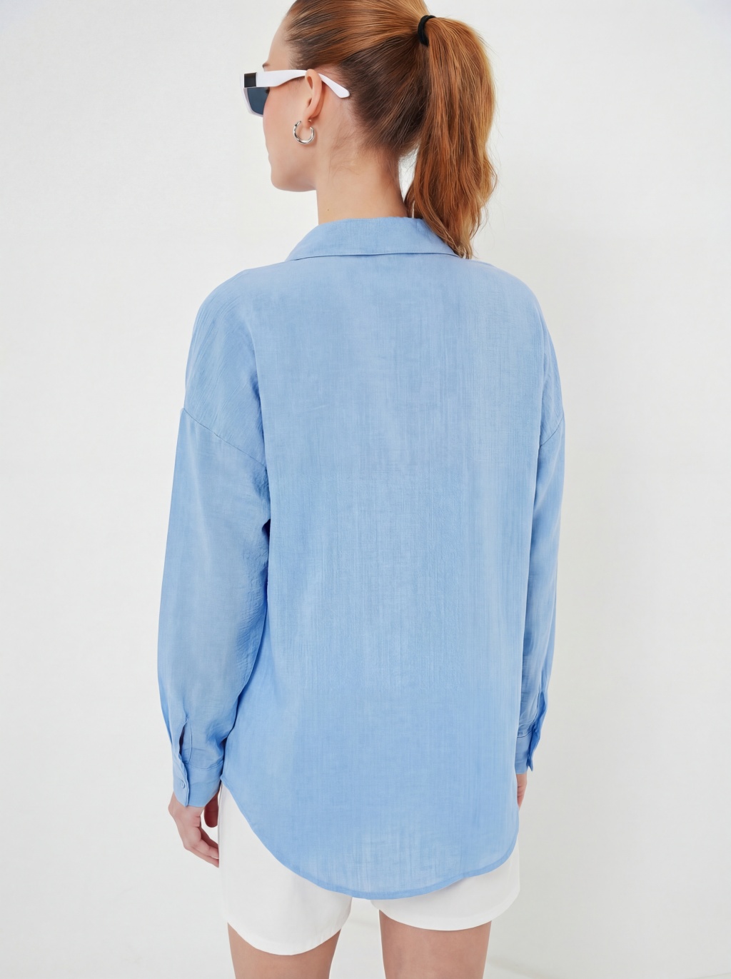 20153 Tek Cepli Oversize Keten Gömlek - Buz Mavi
