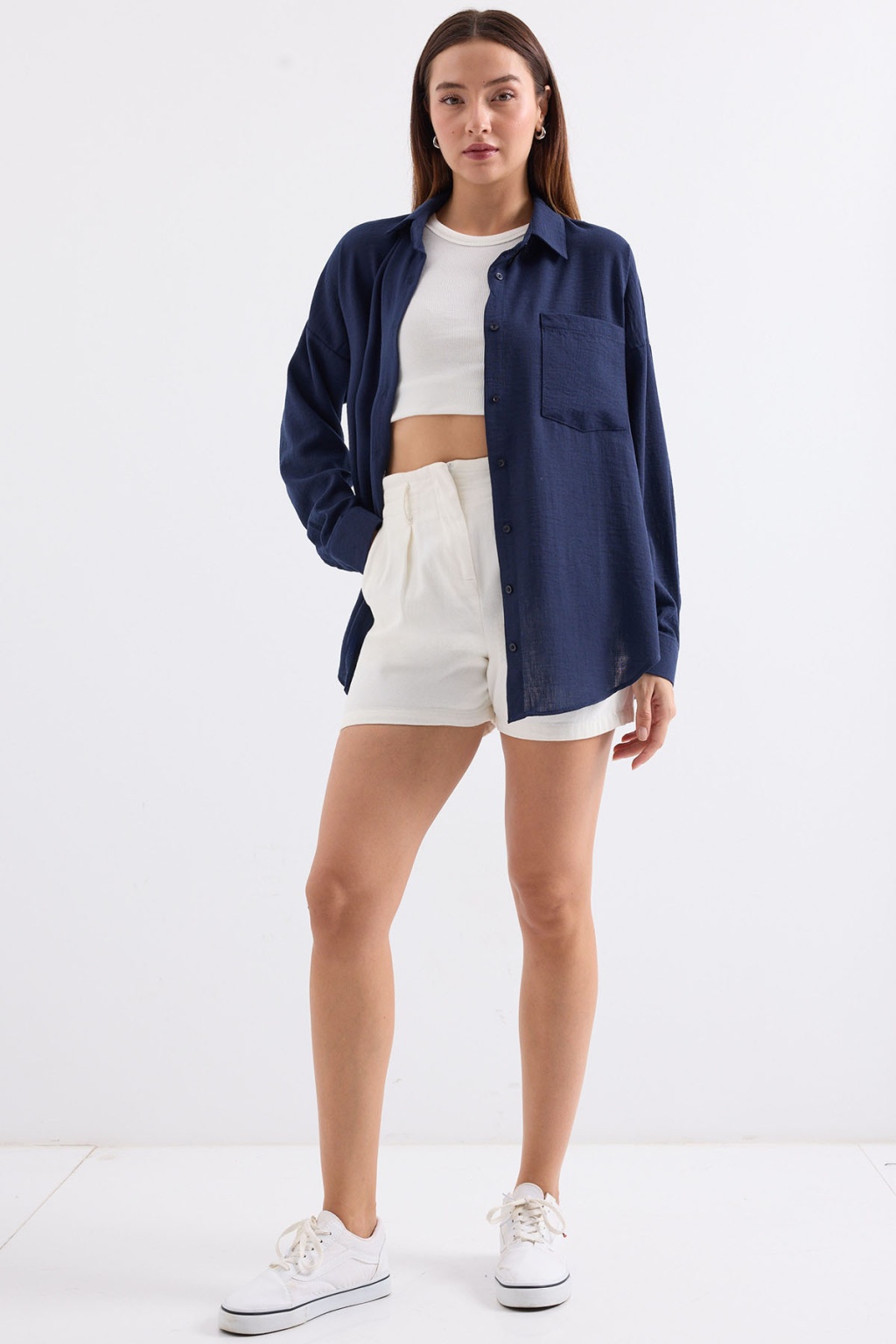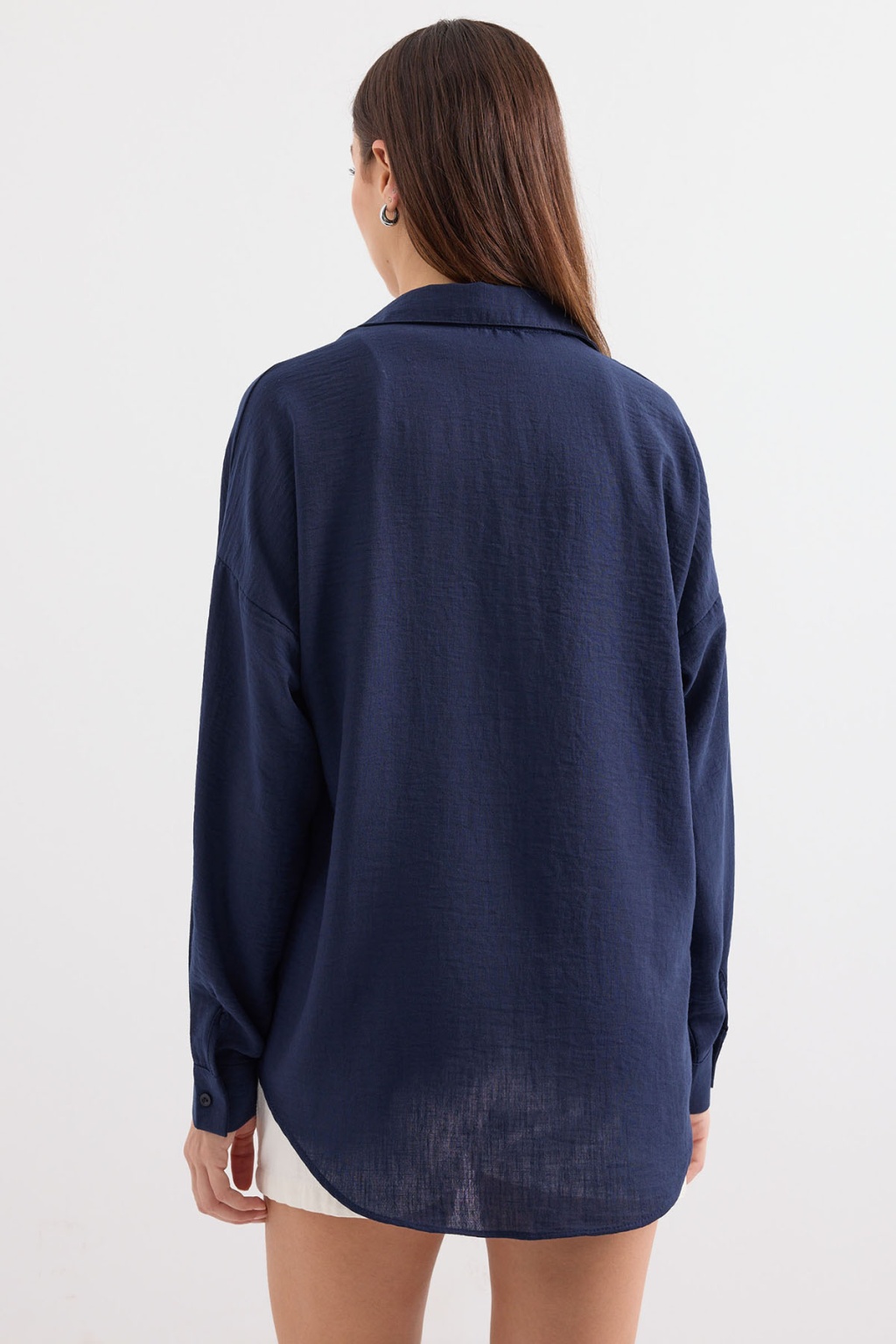 20153 Tek Cepli Oversize Keten Gömlek - D.Lacivert