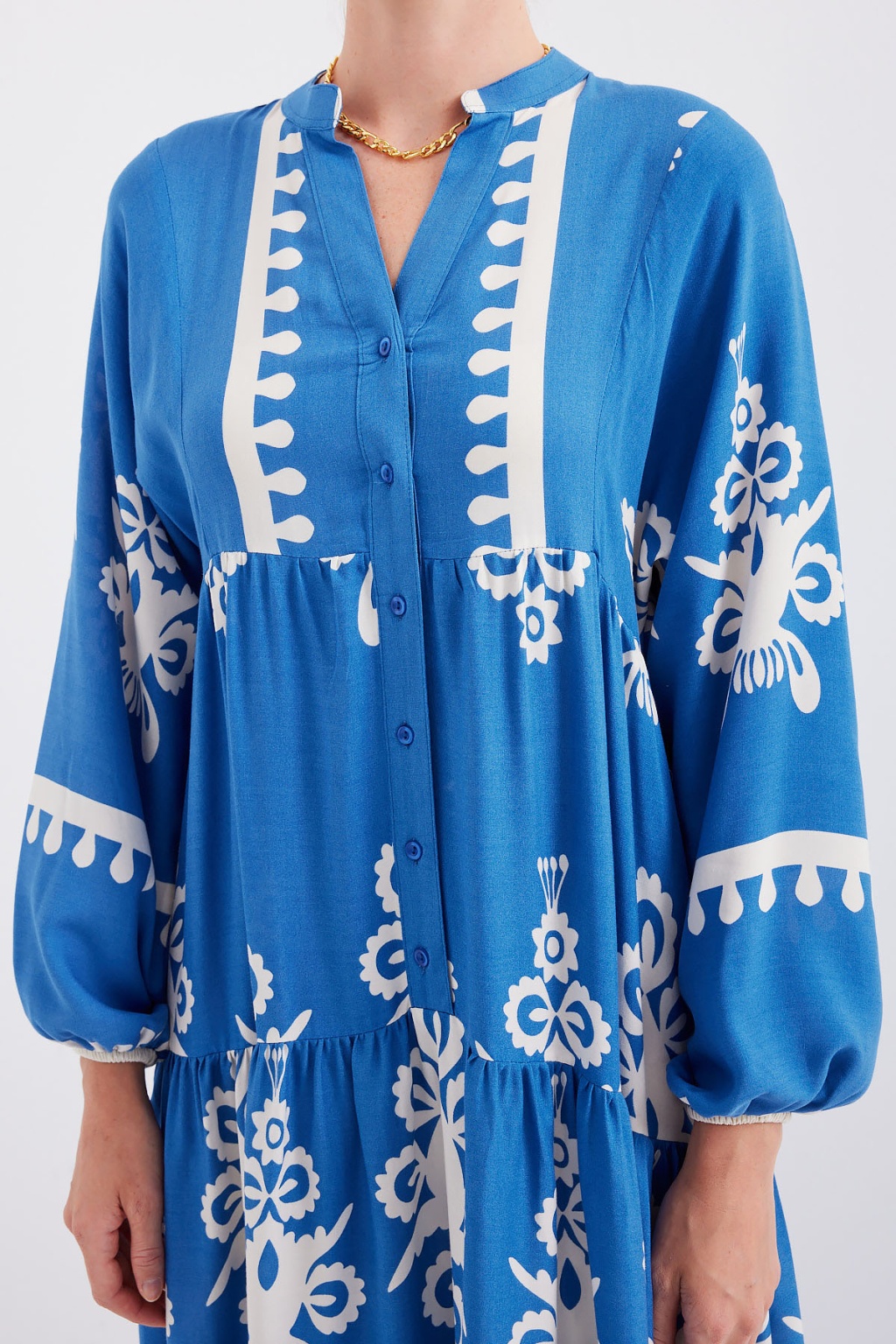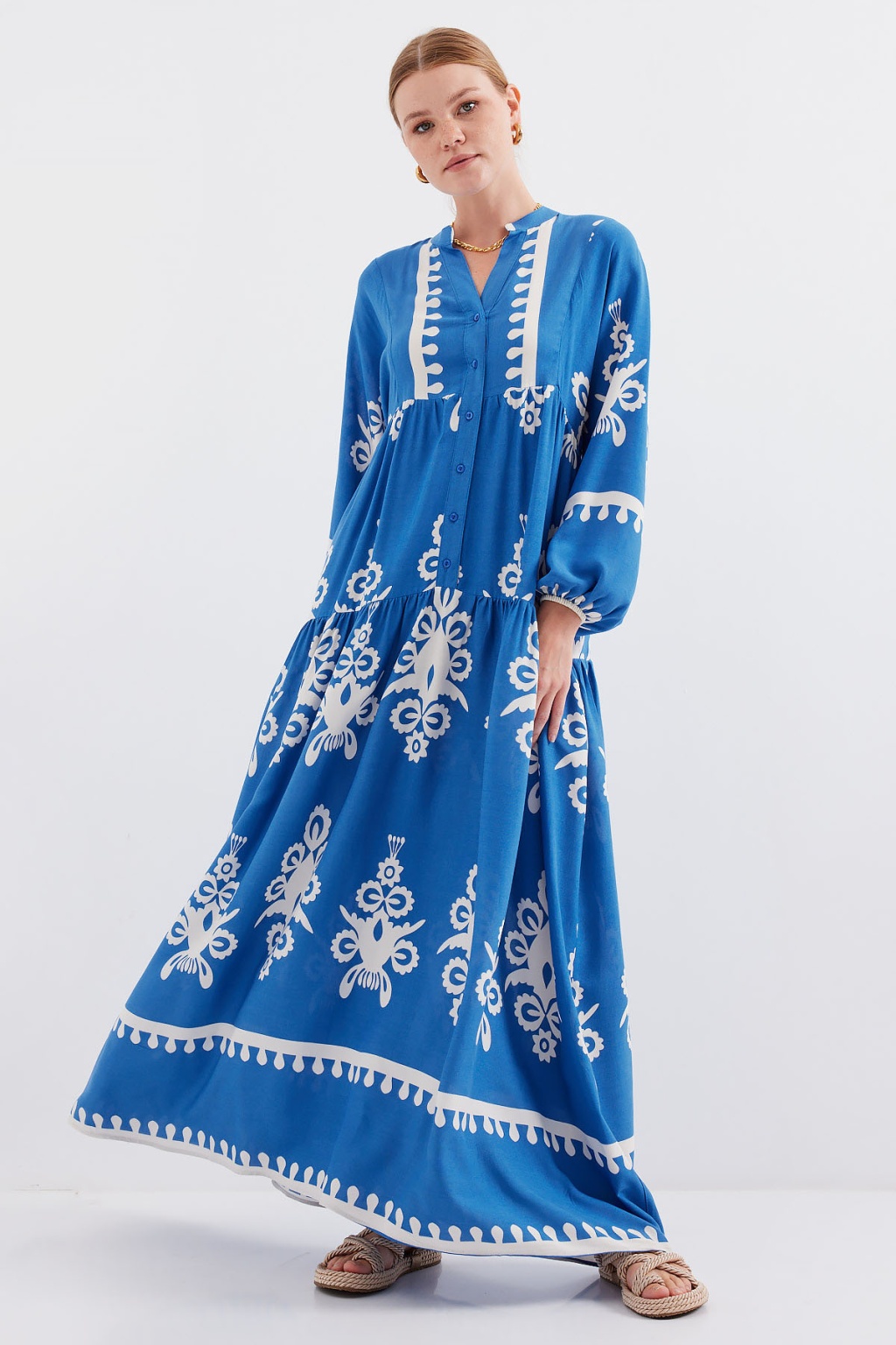 2423 Otantik Desenli Tesettür Elbise - Beyaz - İndigo