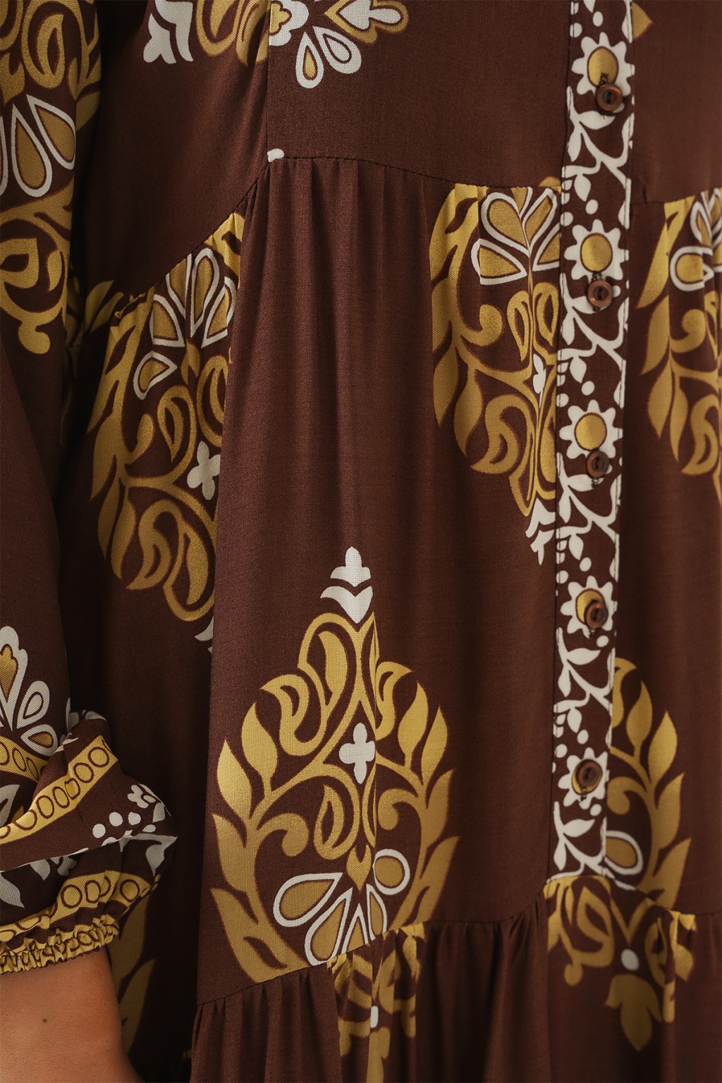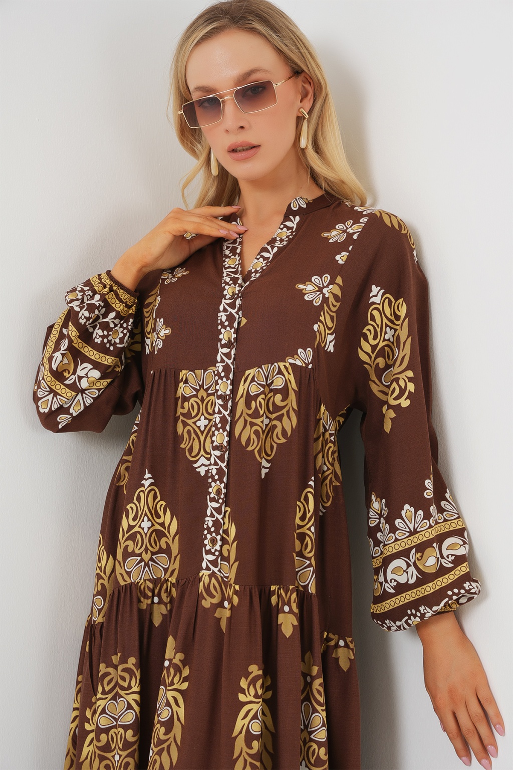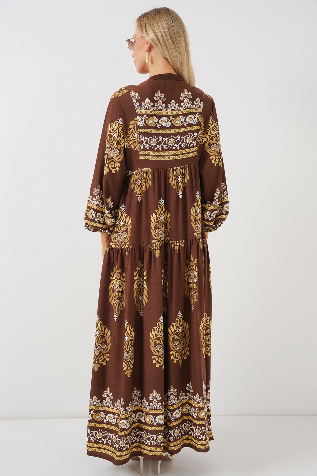 2423 Otantik Desenli Tesettür Elbise - Beyaz - Kahve