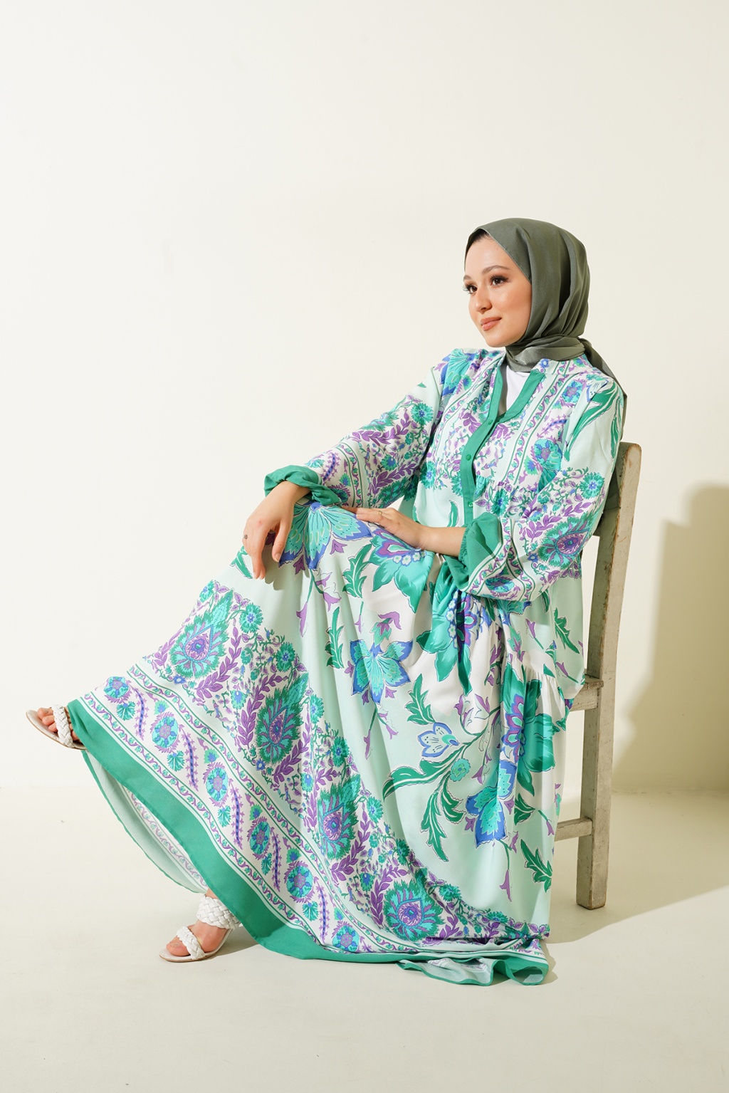 2423 Otantik Desenli Tesettür Elbise - D. Mint