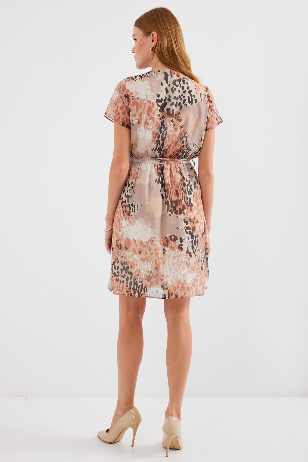 2502 Kısa Kol Desenli Şifon Elbise - Bej