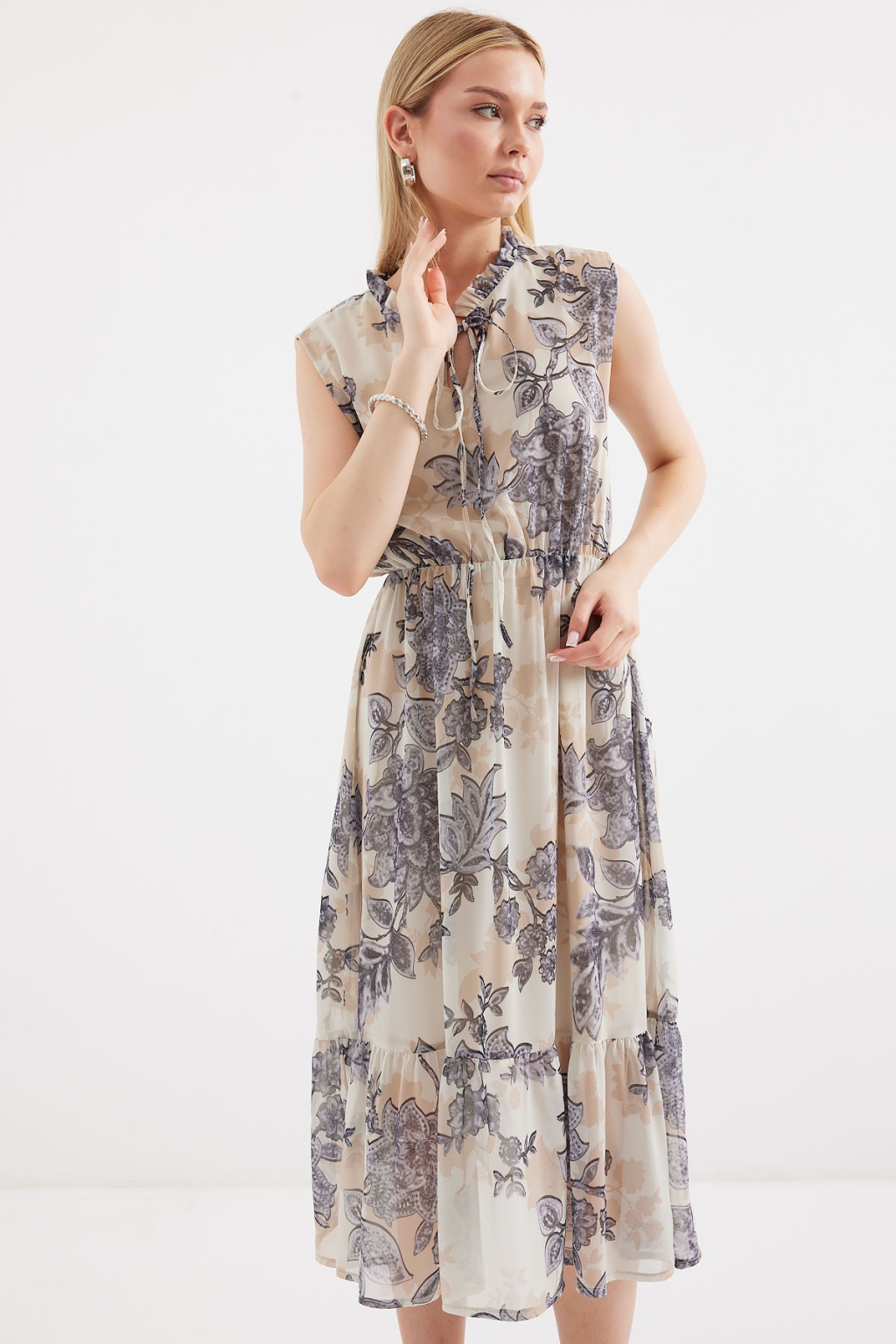 Desenli Sifir Kol Sifon Elbise