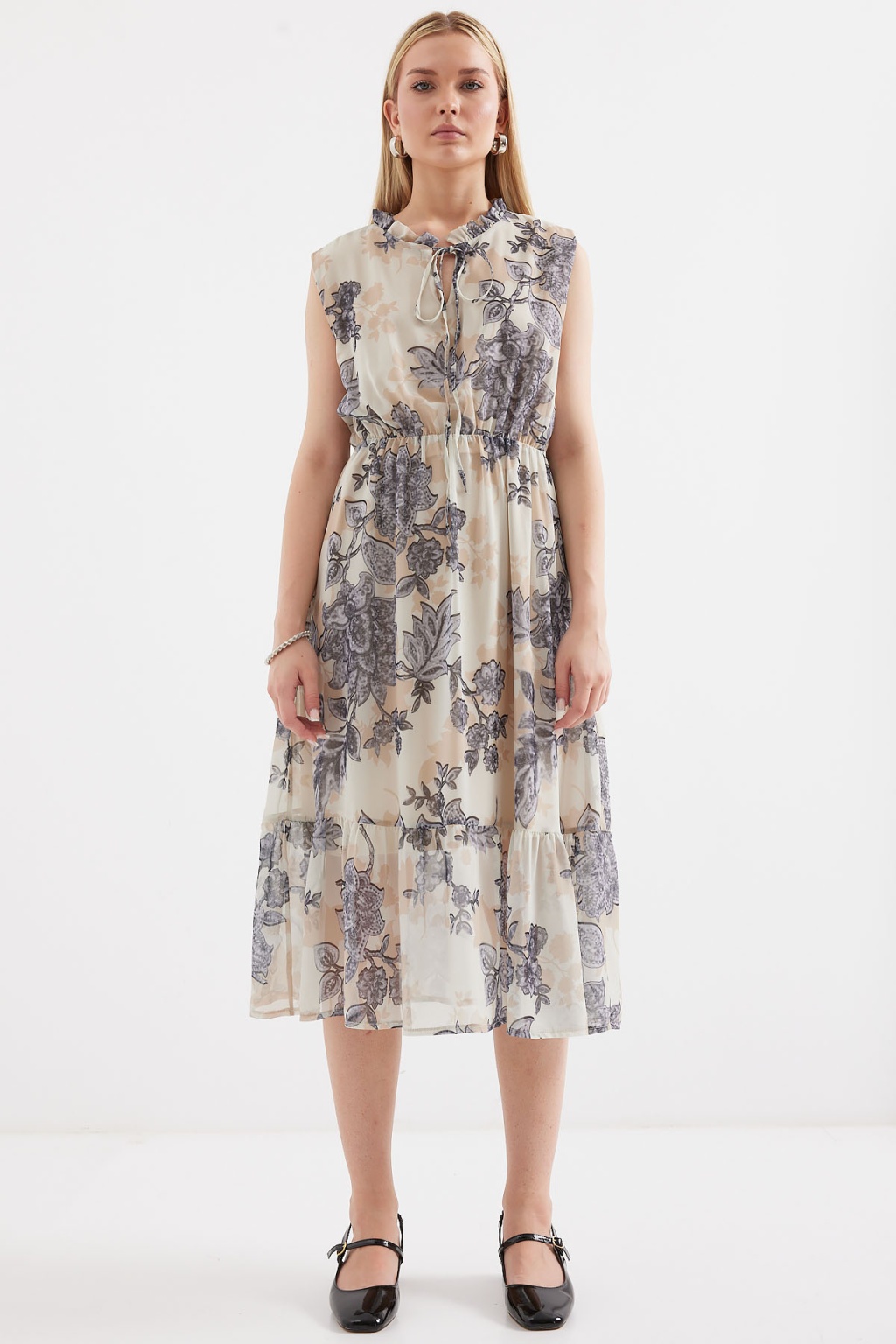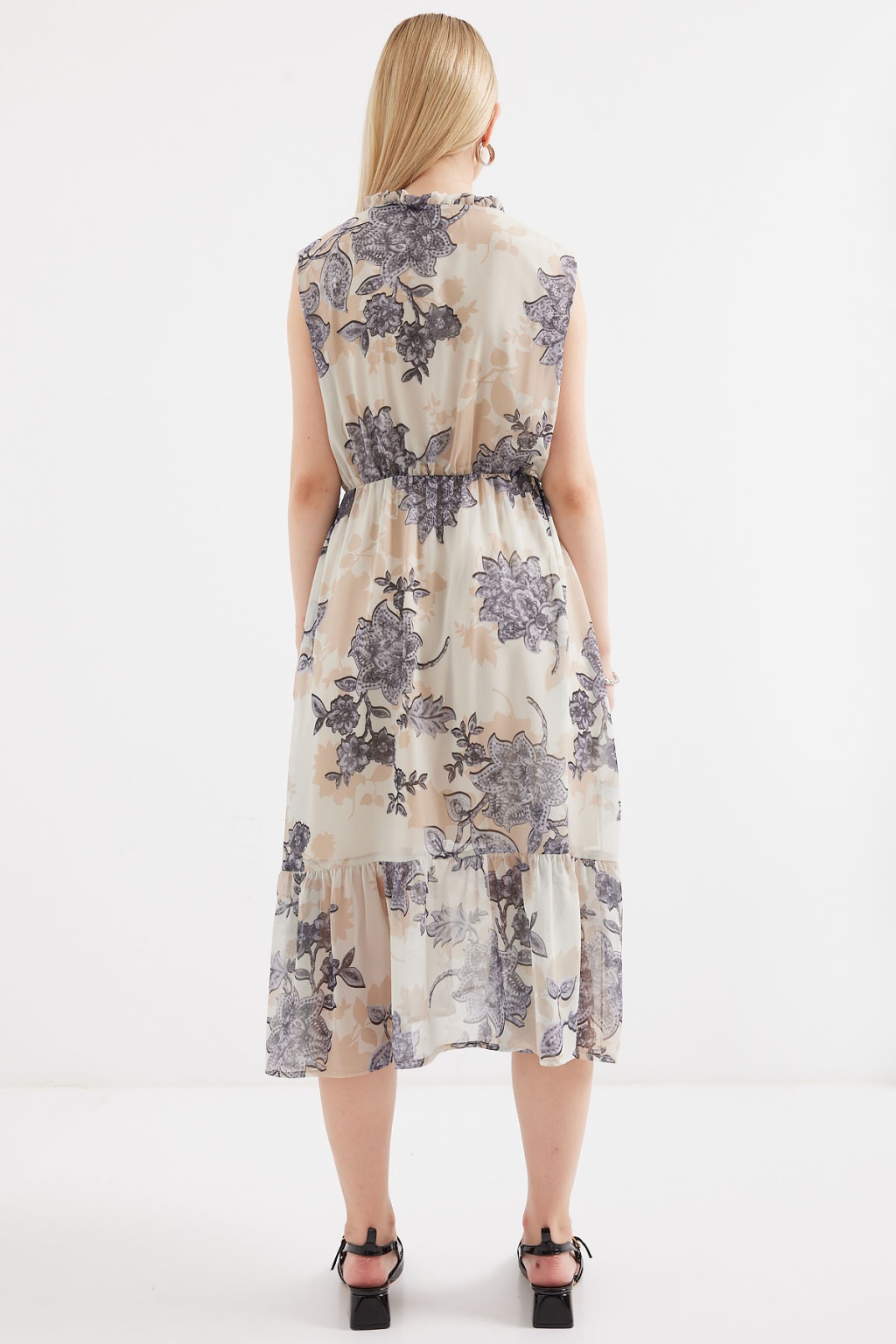 2503 Desenli Sıfır Kol Şifon Elbise - Antrasit