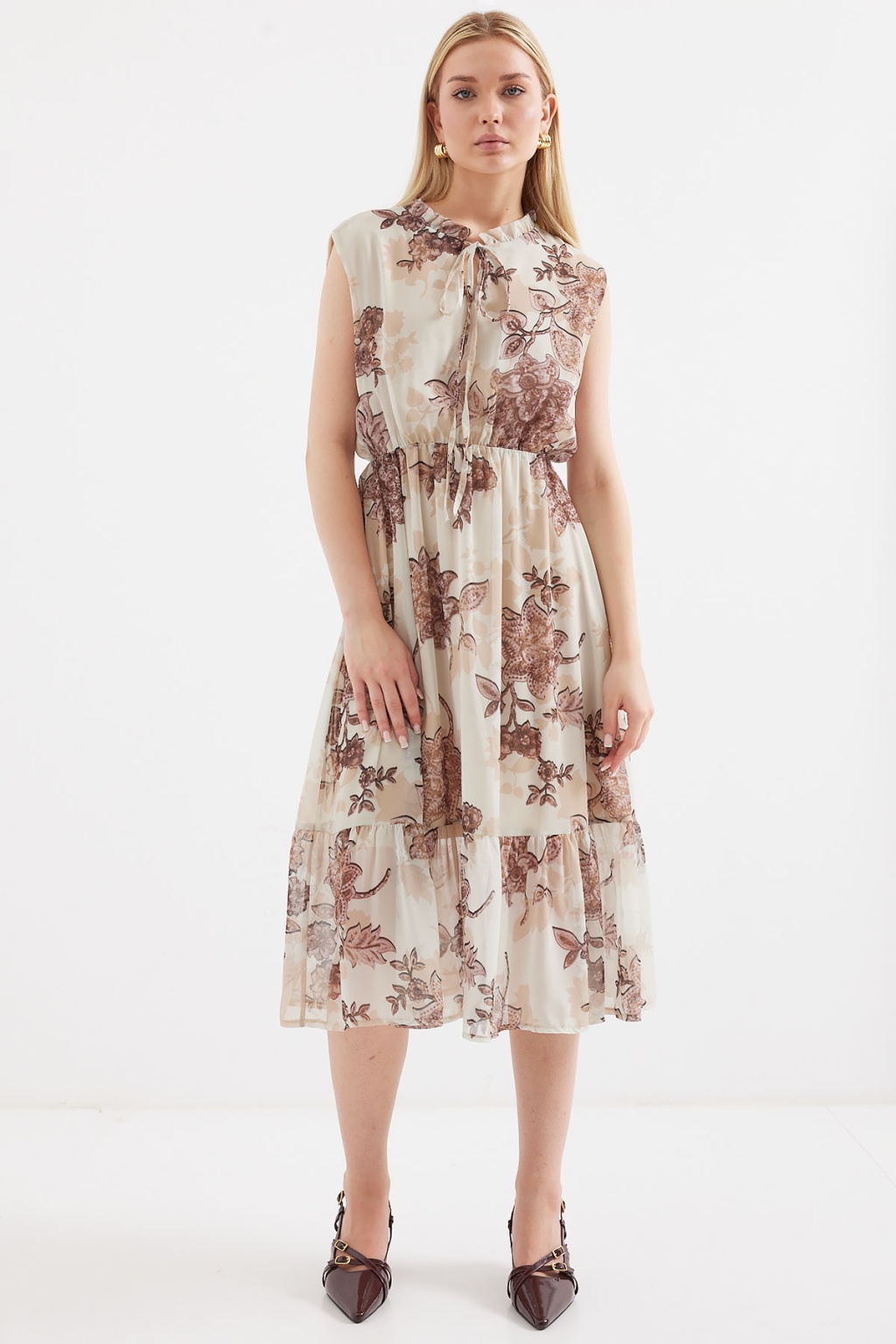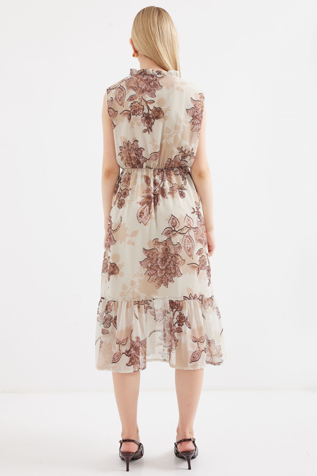 2503 Desenli Sıfır Kol Şifon Elbise - Kahverengi
