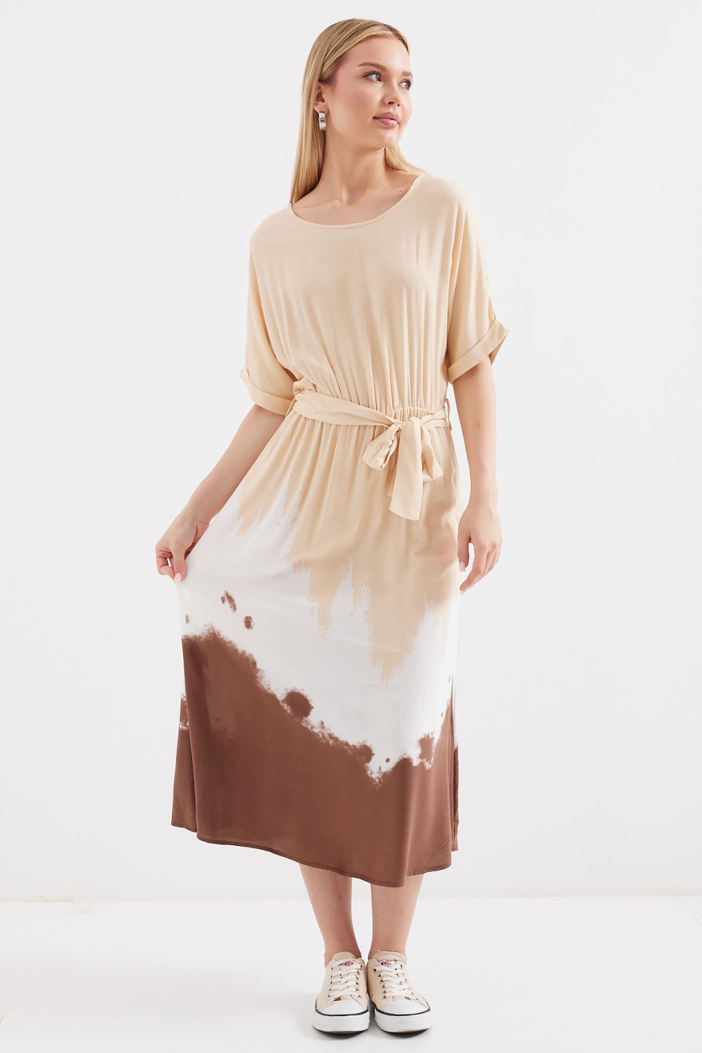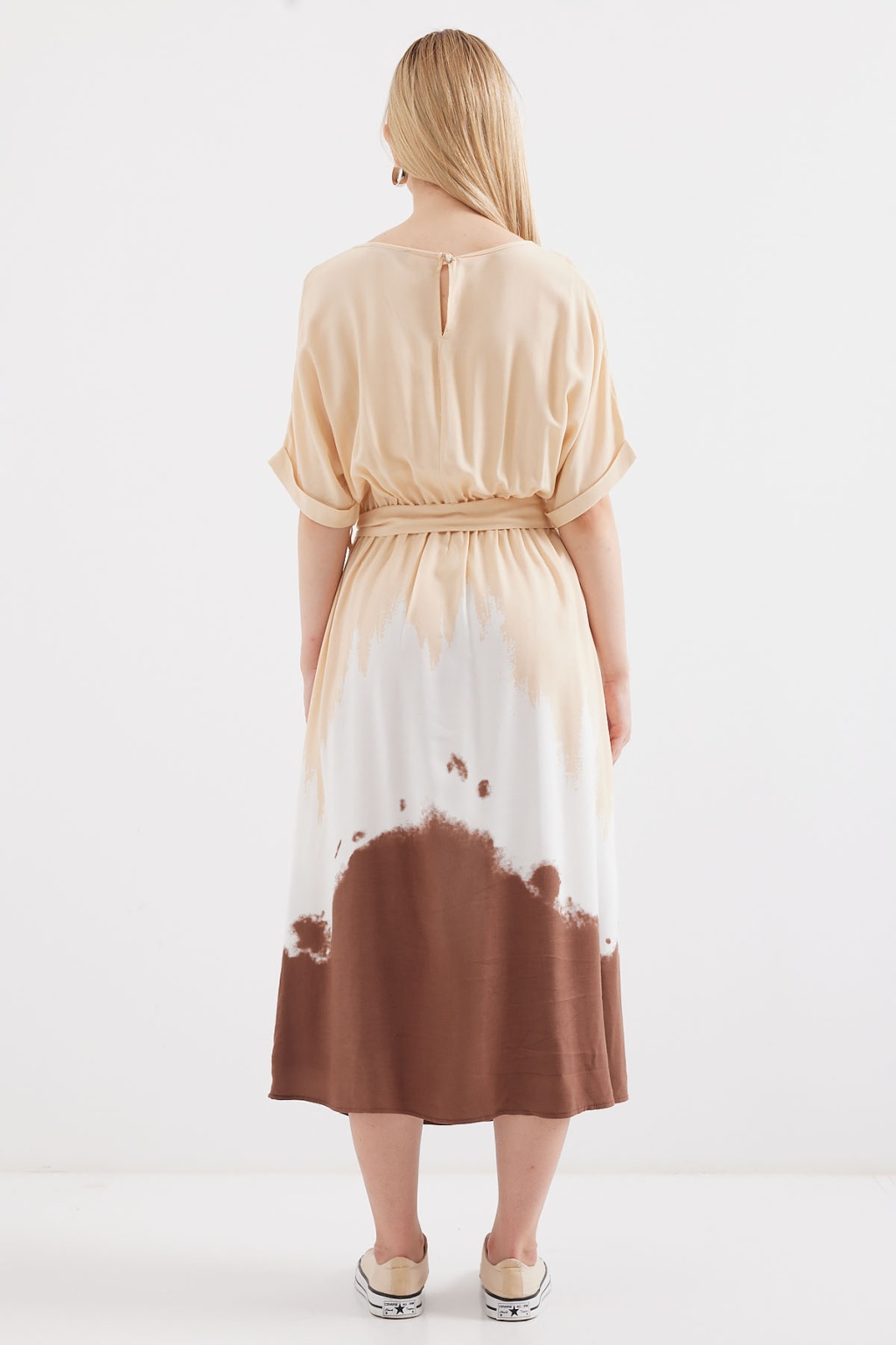 2504 Desenli Kısa Kol Viskon Elbise - Krem