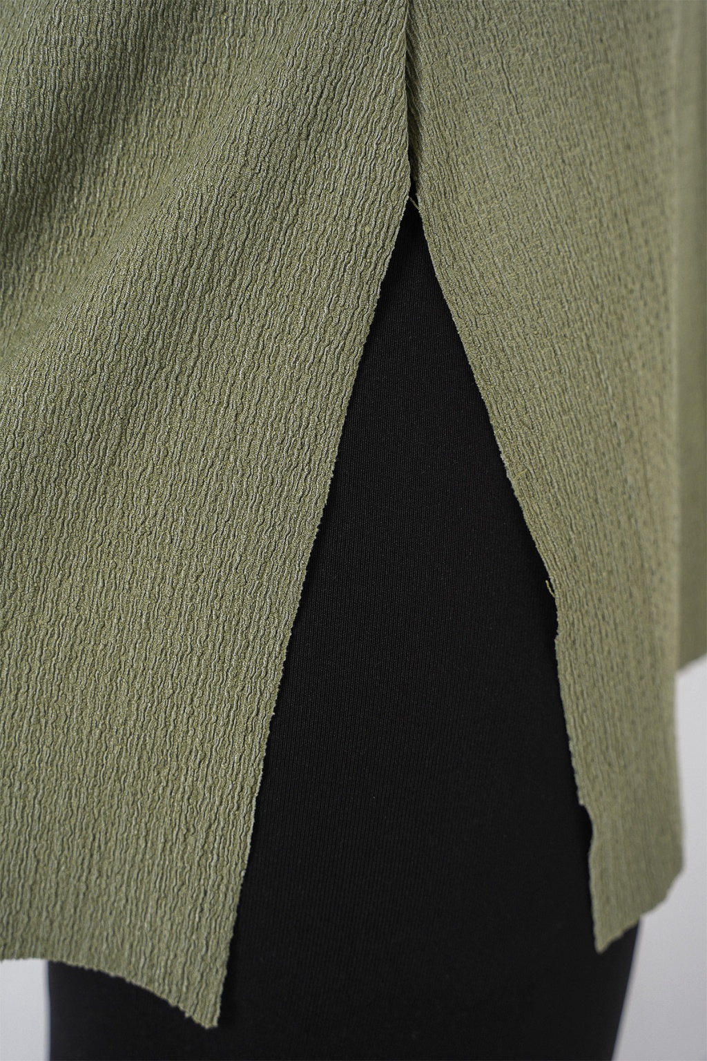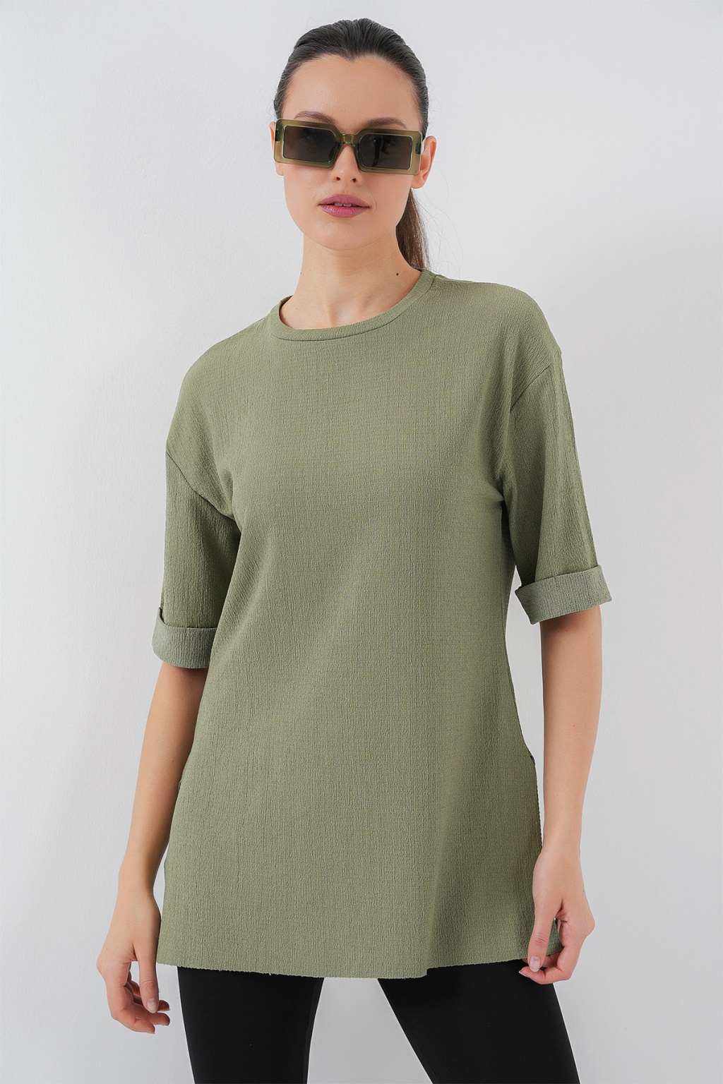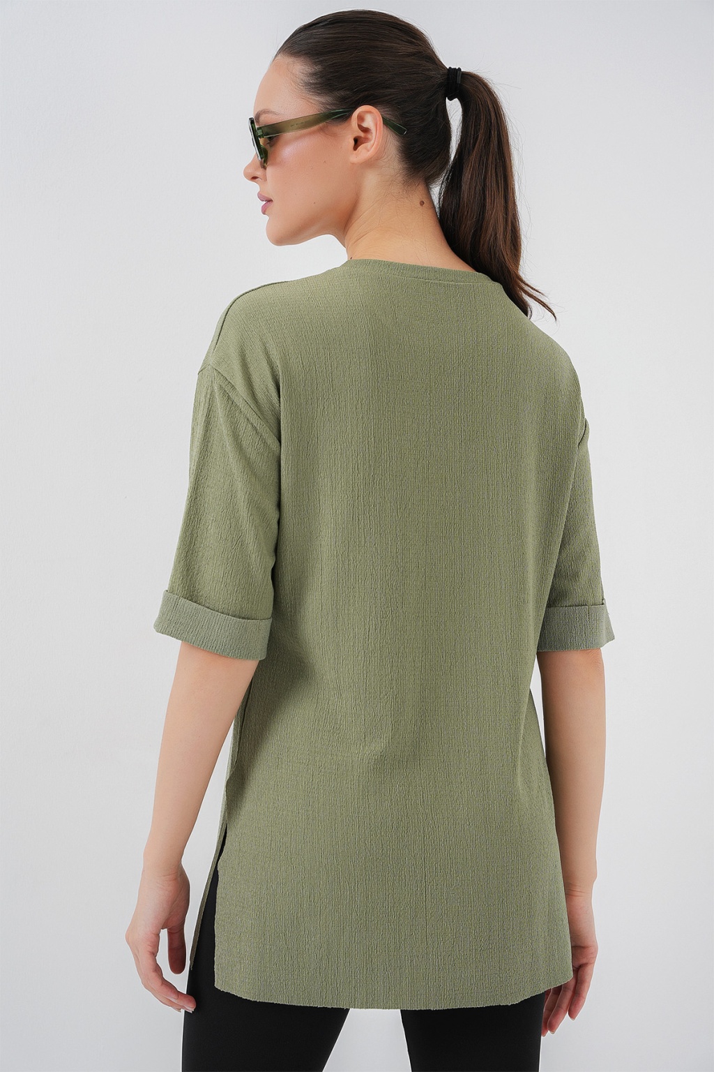 4332 Yanı Yırtmaçlı Örme Tişört - Çağla