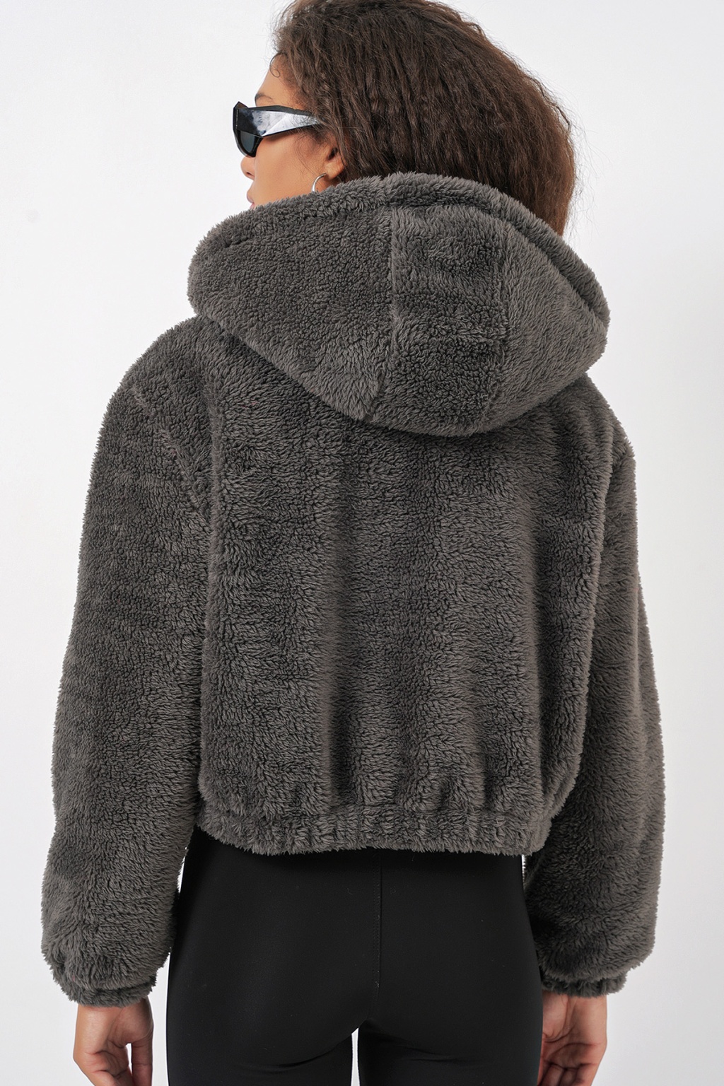 5193 Kapüşonlu Peluş Crop Ceket - Antrasit