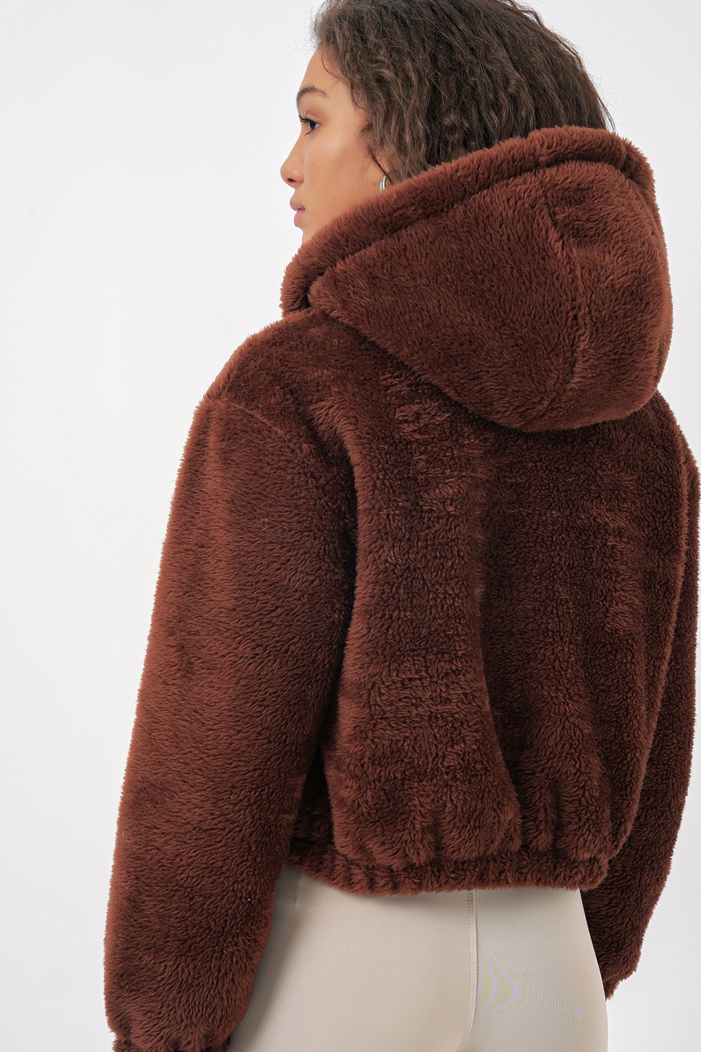 5193 Kapüşonlu Peluş Crop Ceket - Kahverengi