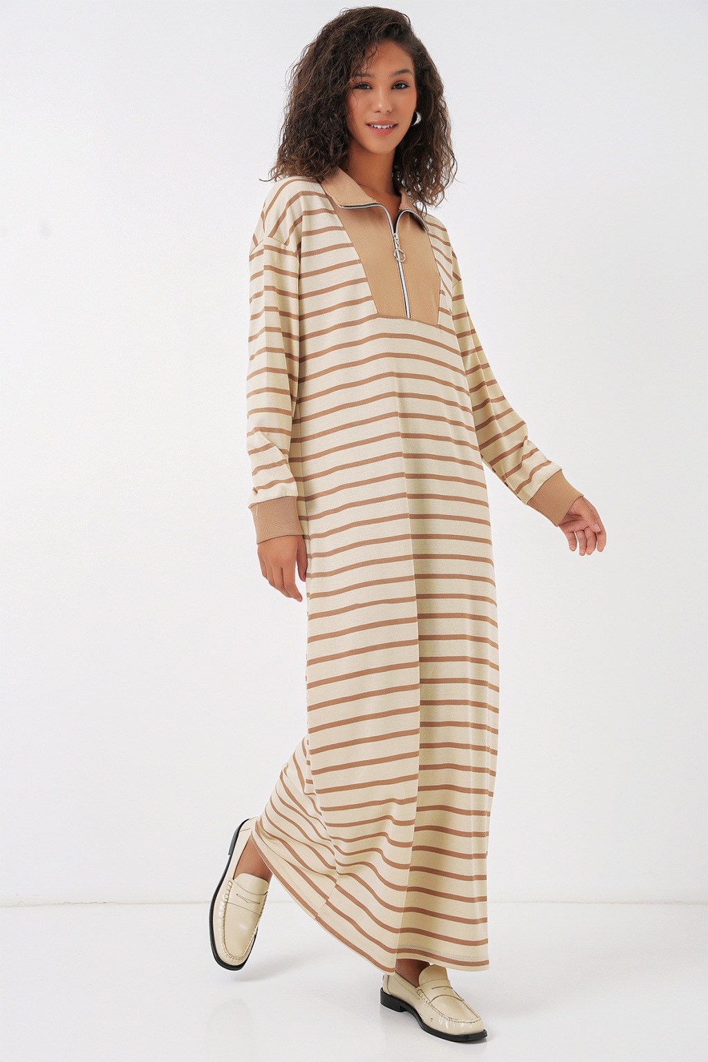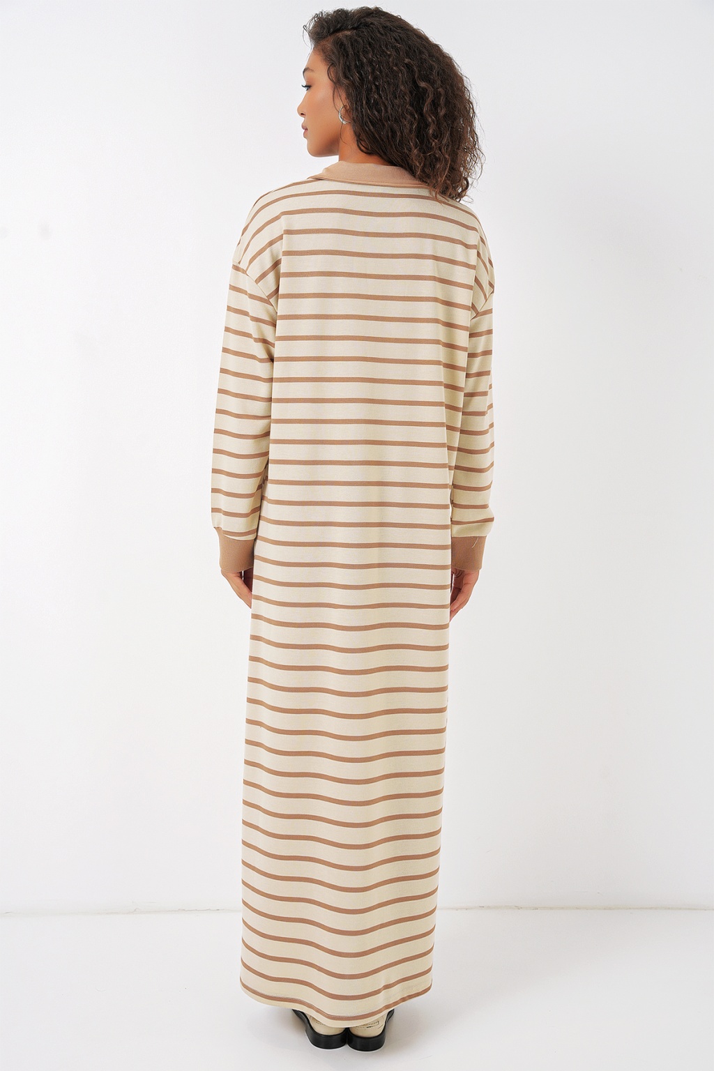 55453 Kadın Fermuar Detaylı Çizgili Uzun Elbise - Bej