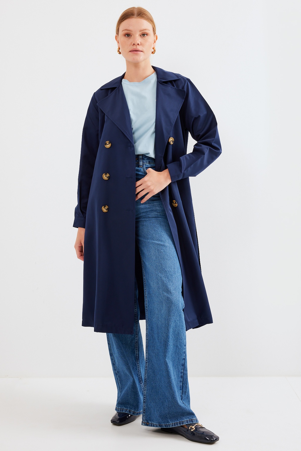 5853 Kruvaze Yaka Trençkot - Lacivert