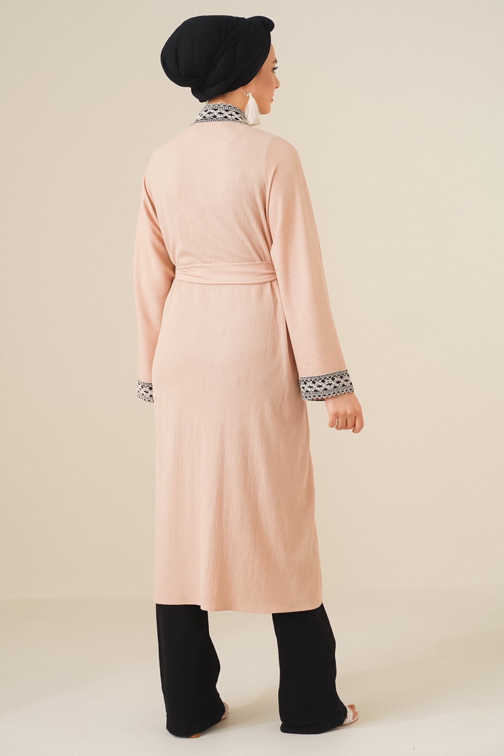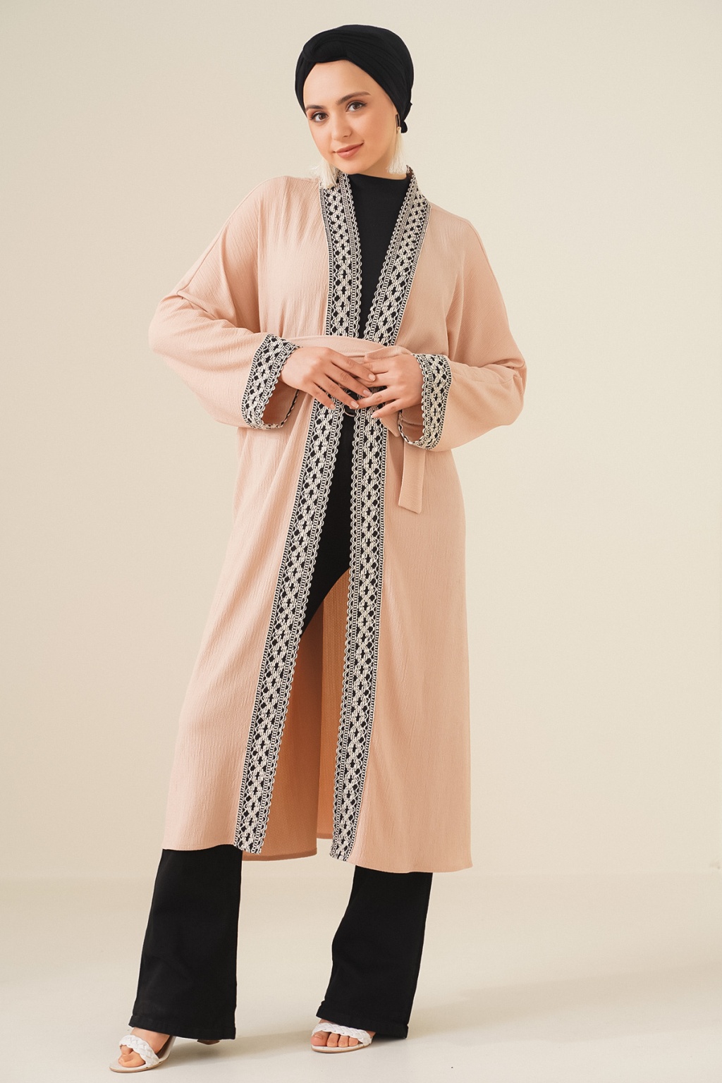 5865 Nakışlı Örme Uzun Kimono - Bisküvi