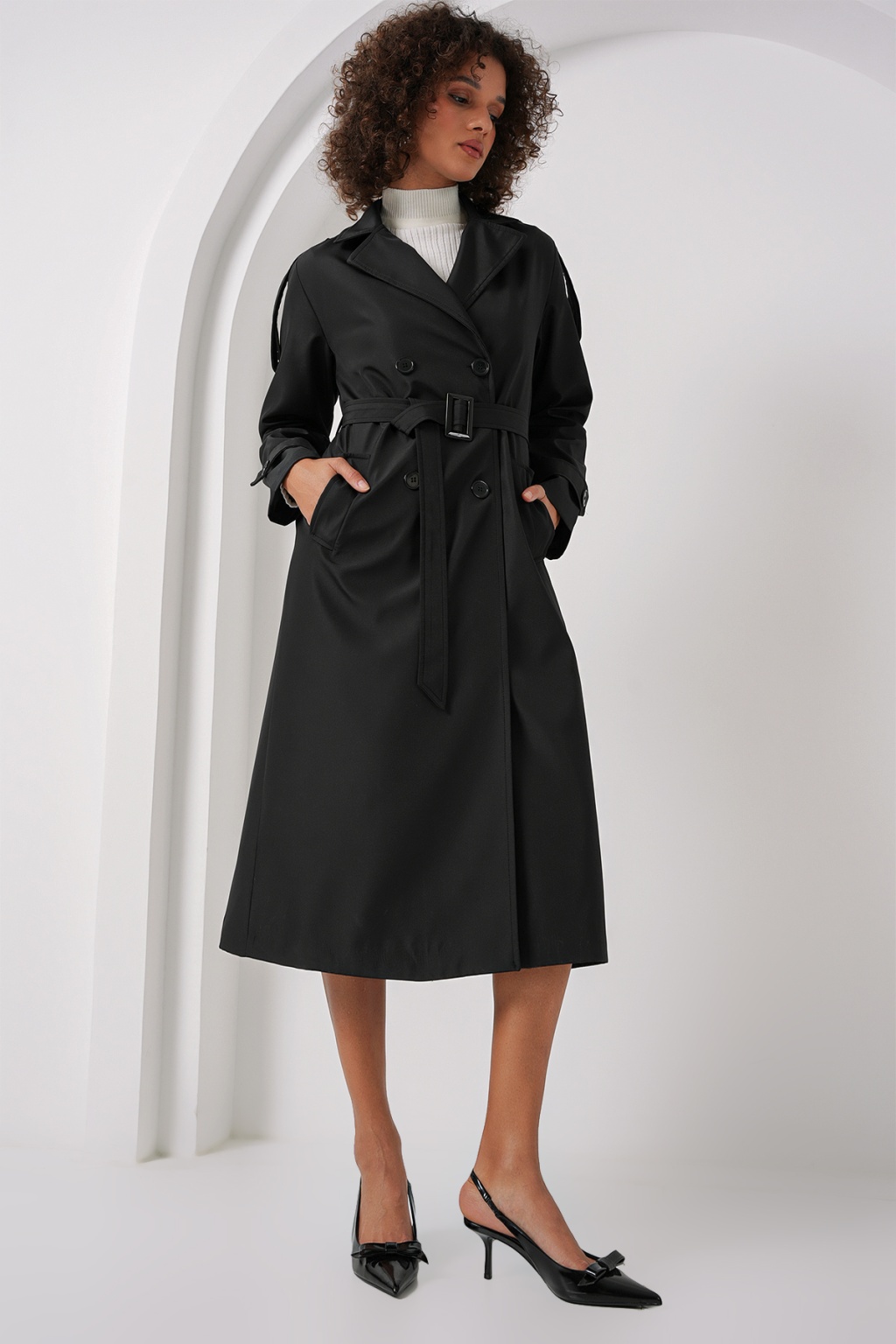 5941 Kruvaze Yaka Uzun Trençkot - Siyah