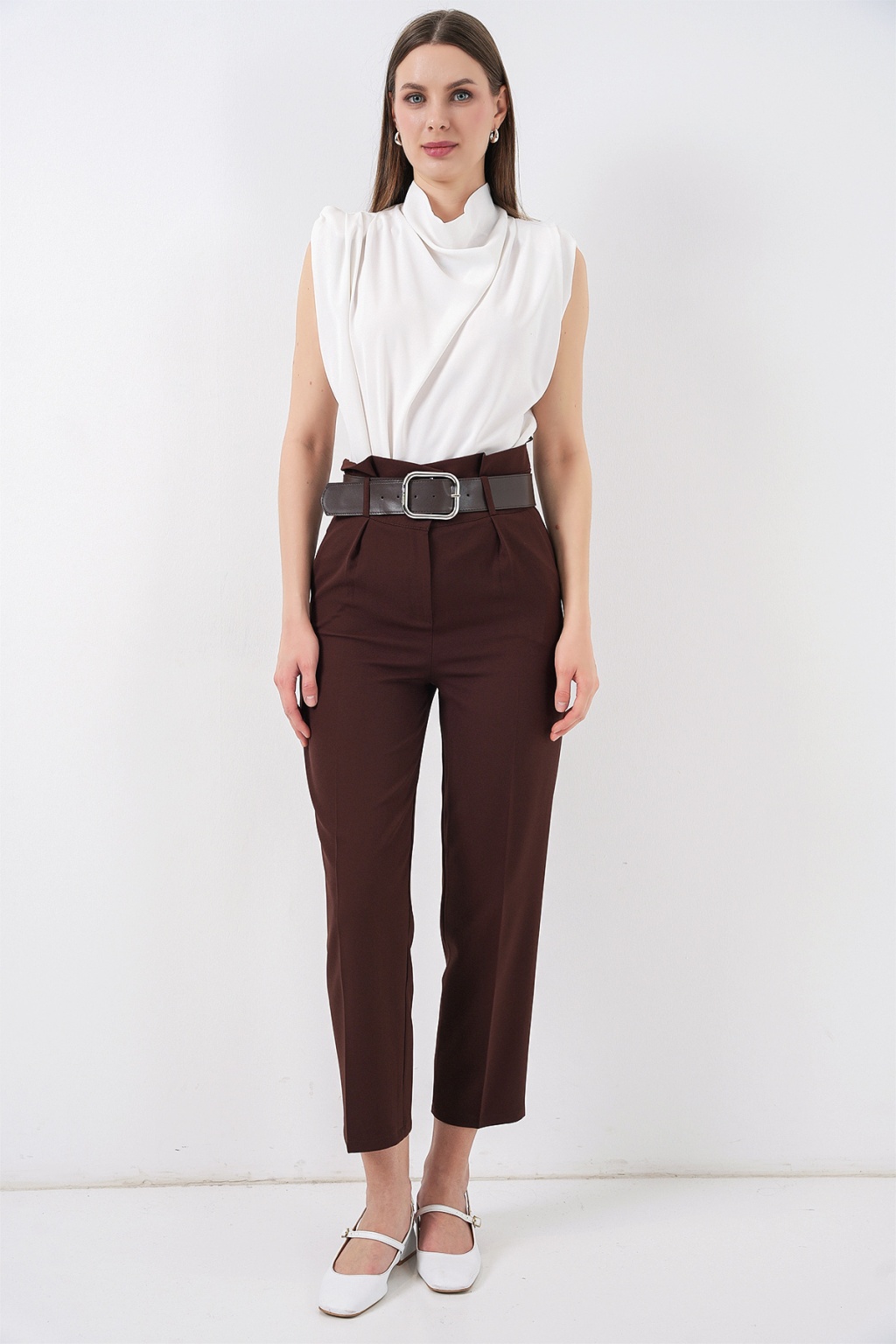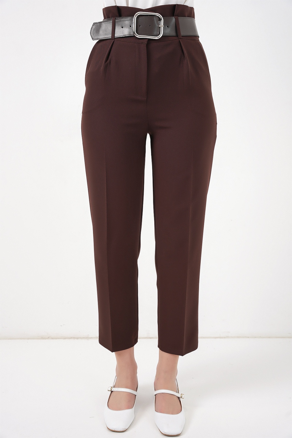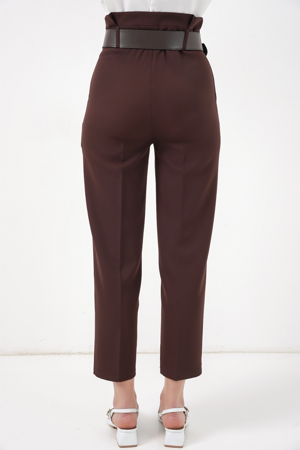 6556 Kemerli Kumaş Pantolon - Kahverengi