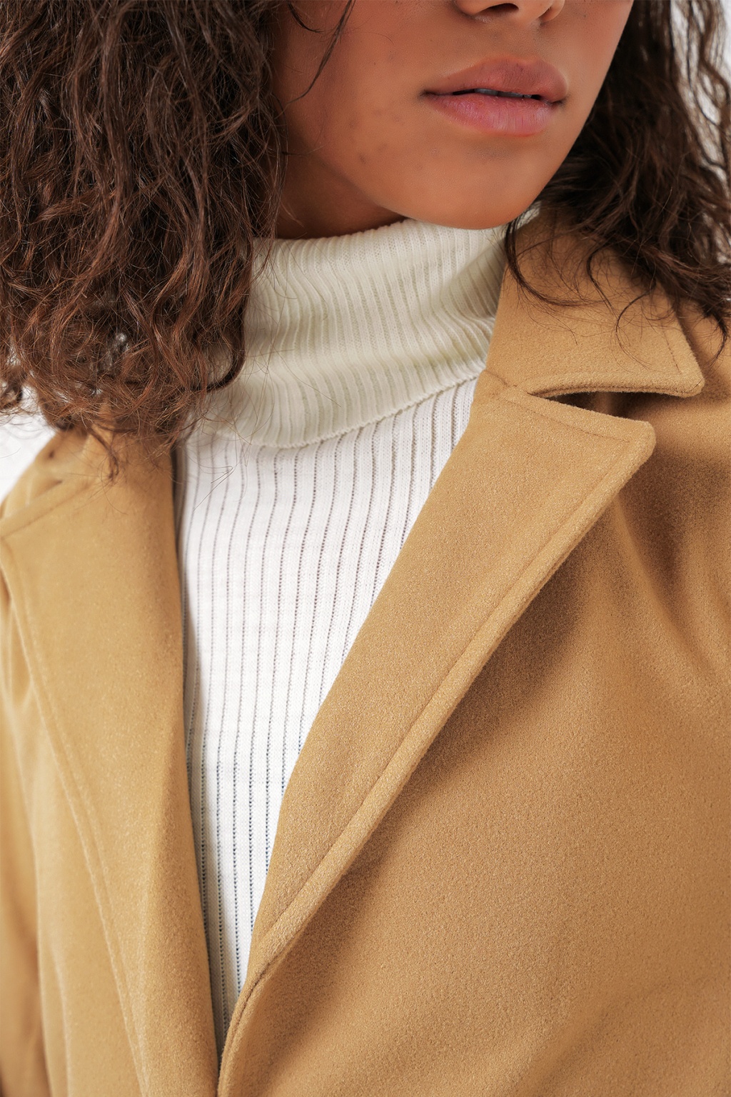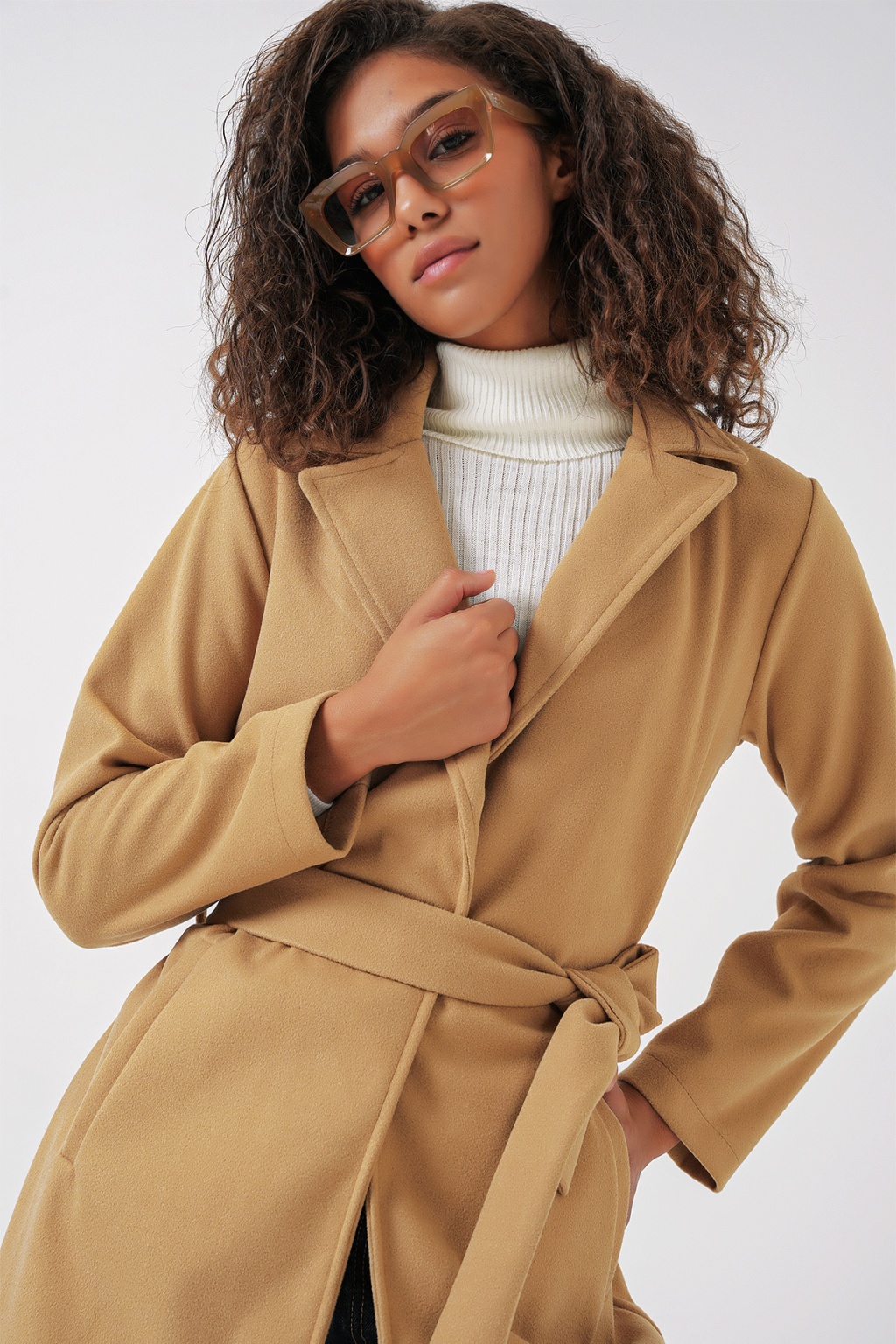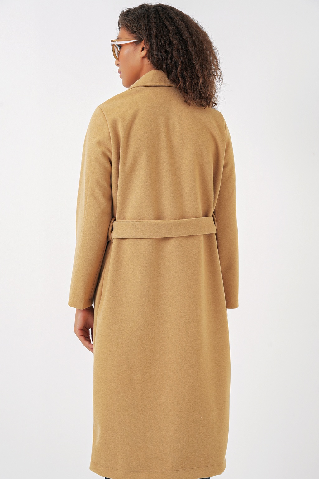 9118 Kruvaze Yaka Kaşe Kaban - Hardal
