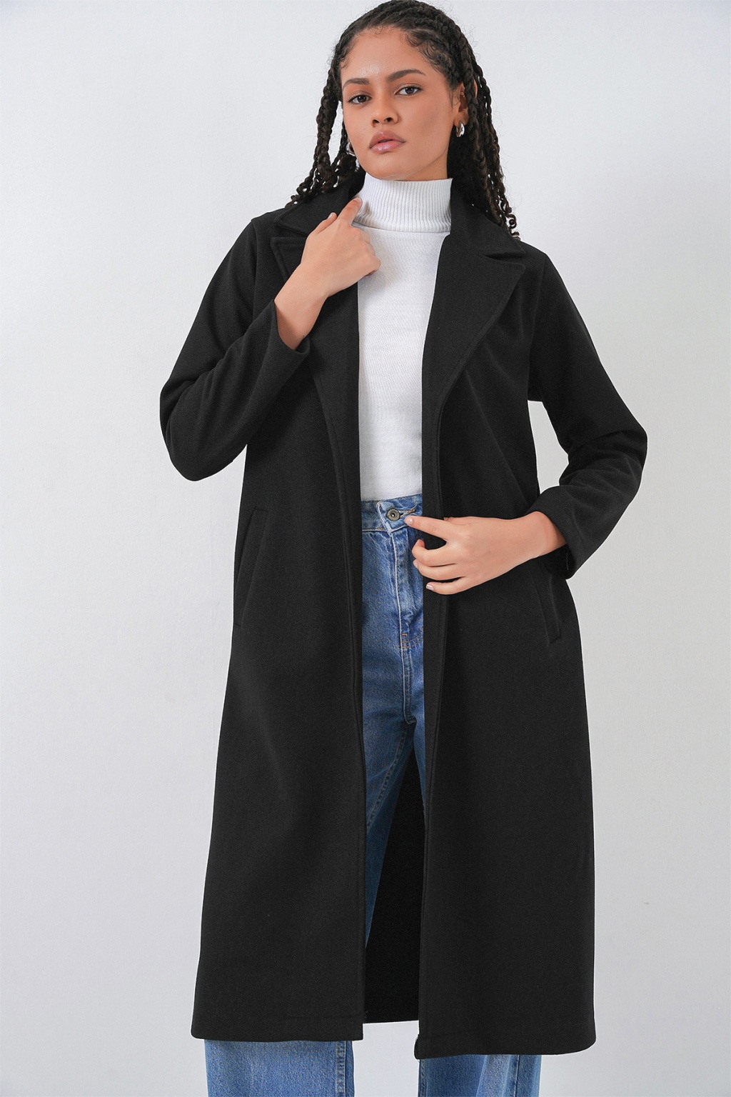 9118 Kruvaze Yaka Kaşe Kaban - Siyah