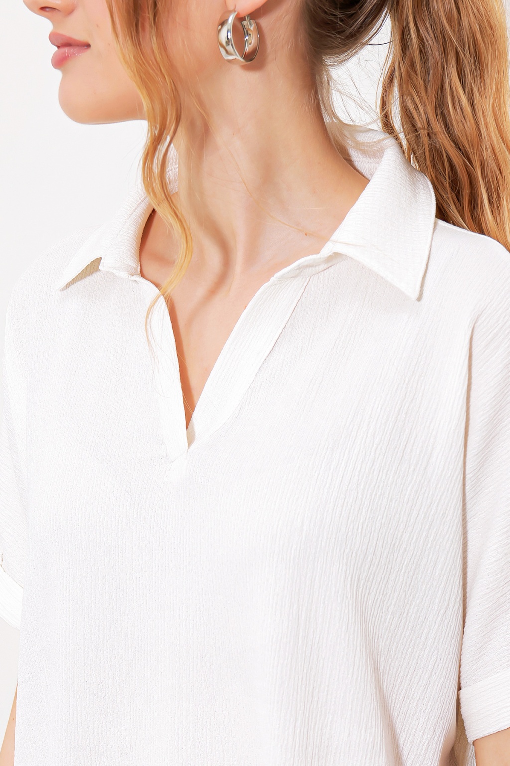 Kadın Beyaz Oversize Polo Yaka Örme Bluz 0486