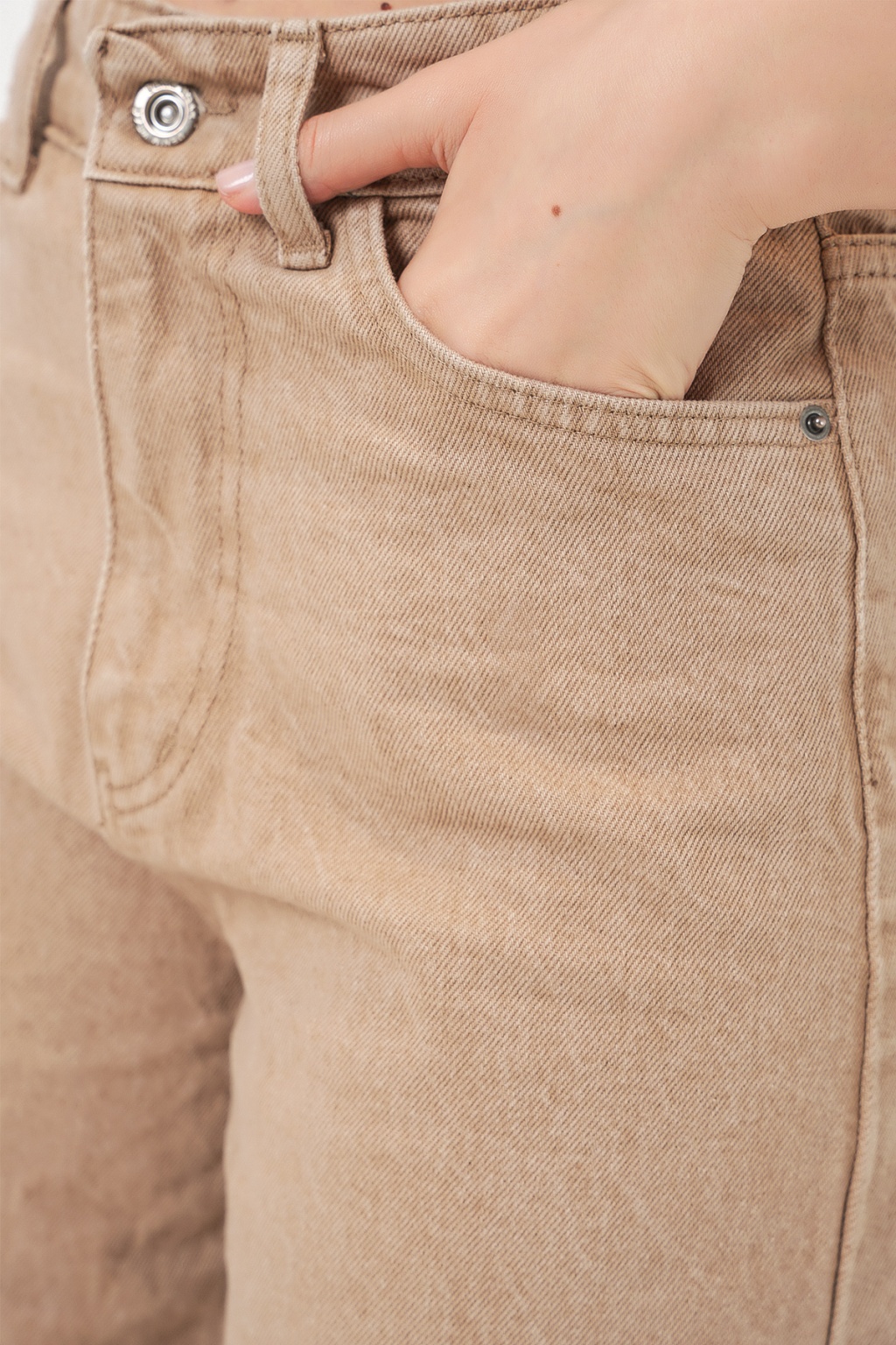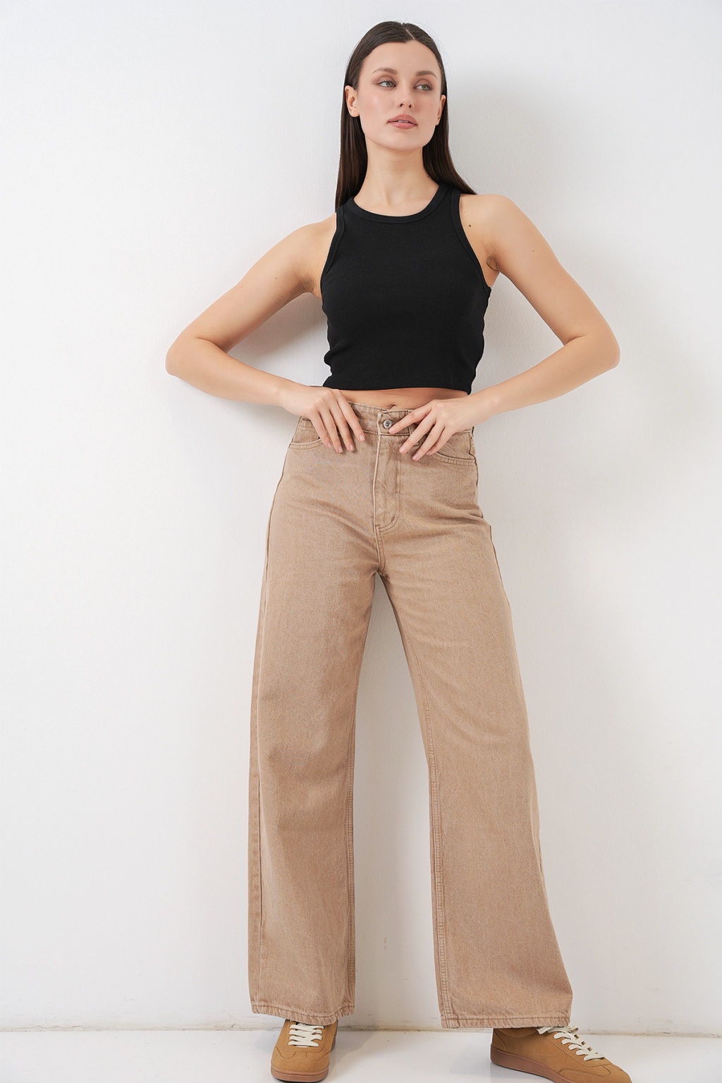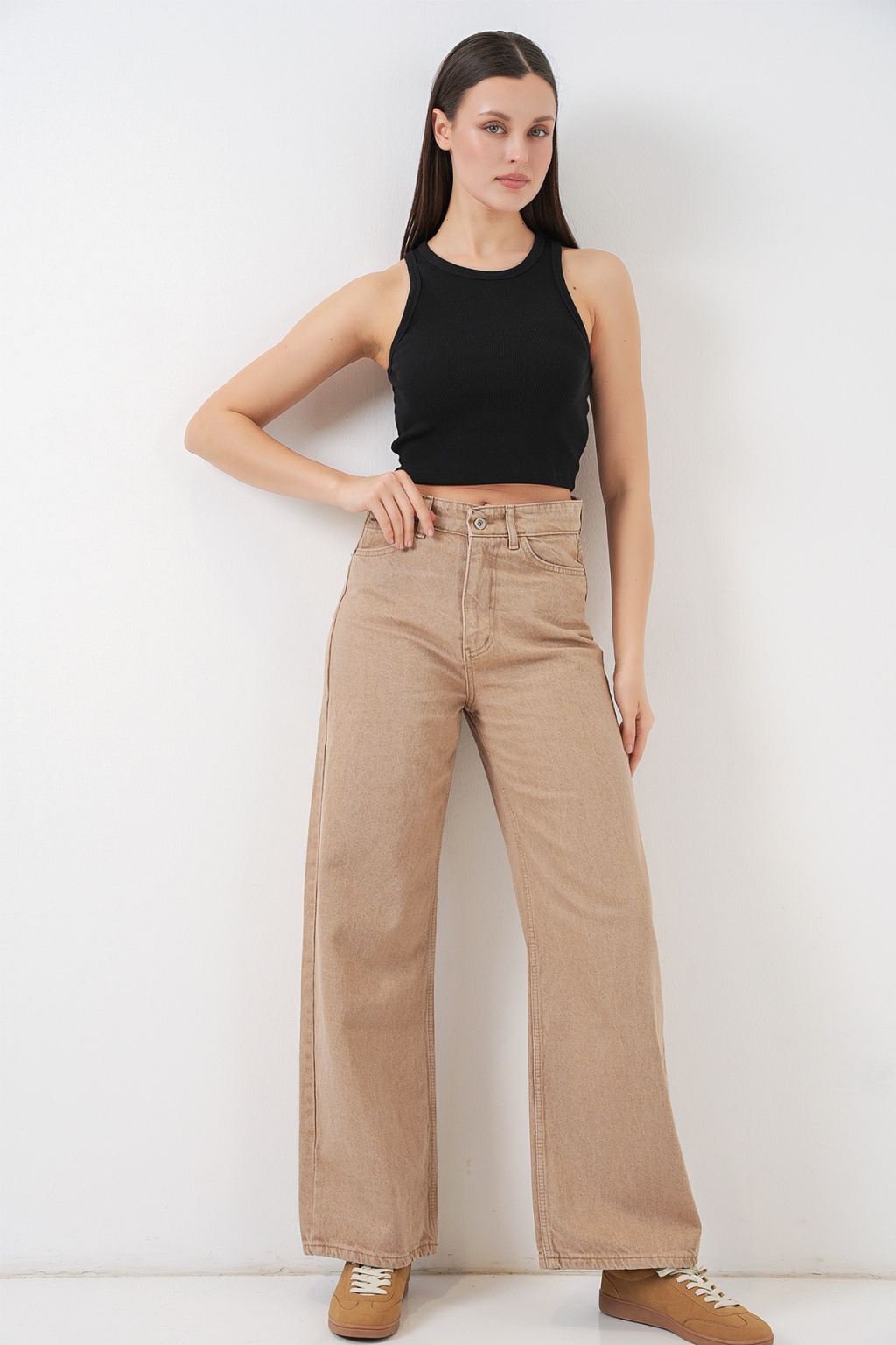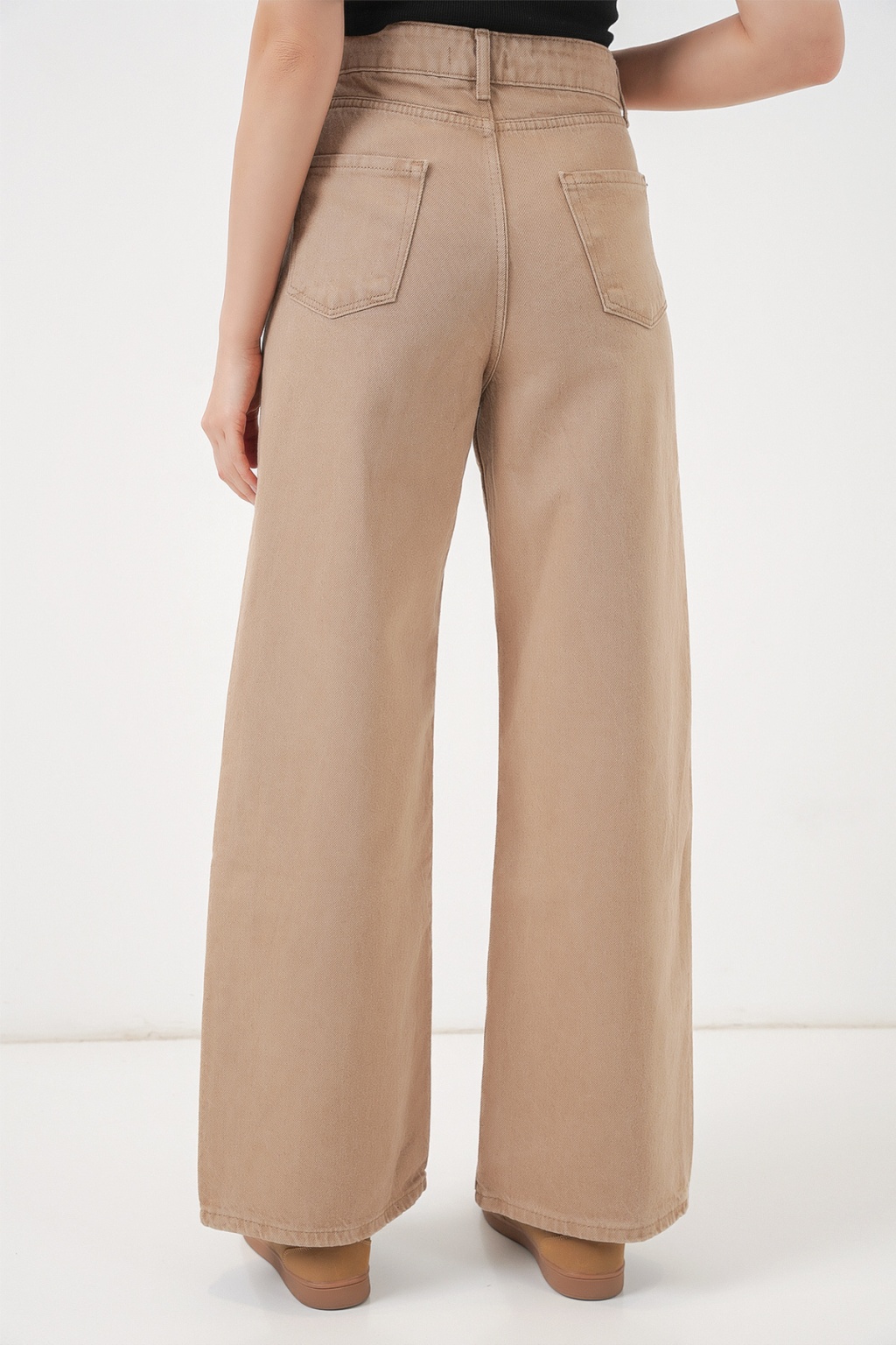Kadın Bol Paça Yüksek Bel Palazzo Kot Pantolon 6656 - Vizon