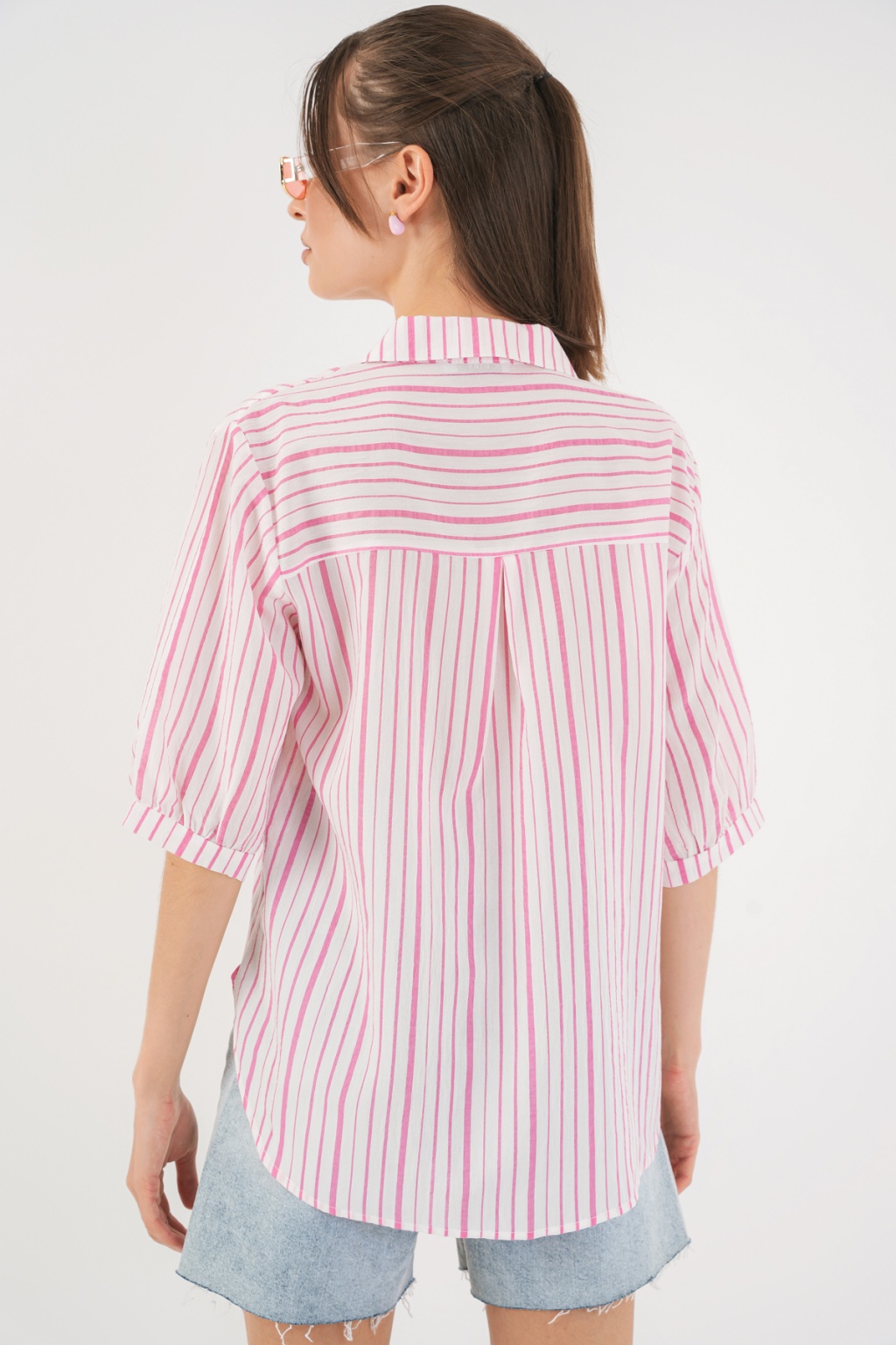 Kadın Çizgili Kısa Kol Gömlek 20345 - Pudra