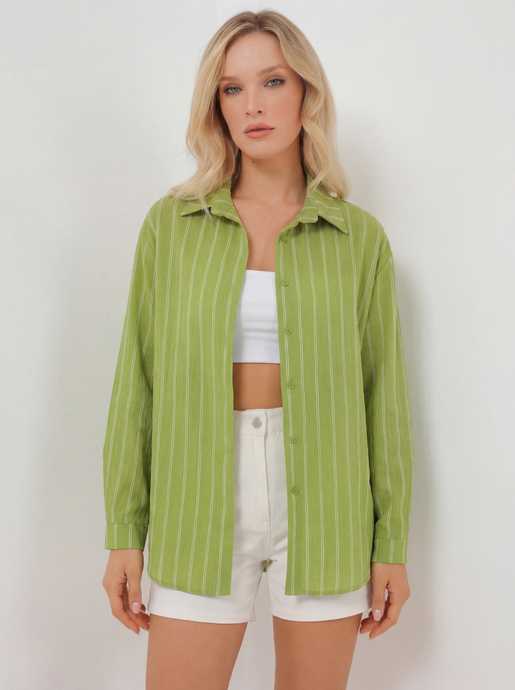 Kadın Çizgili Oversize Gömlek 20293 - E.Yeşil