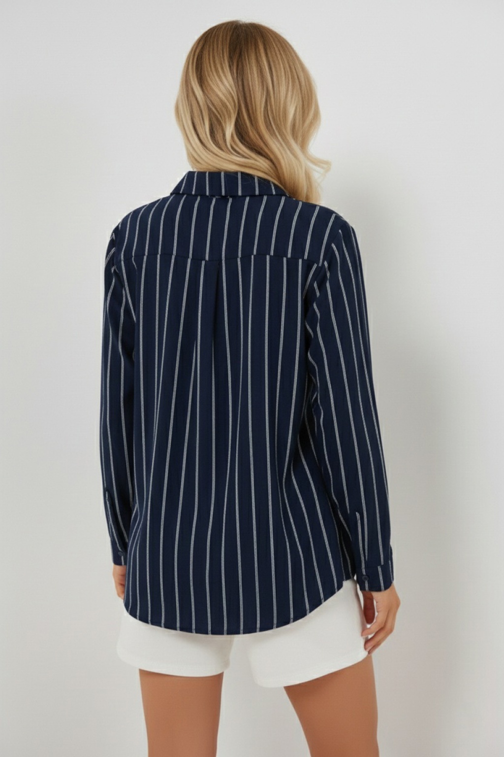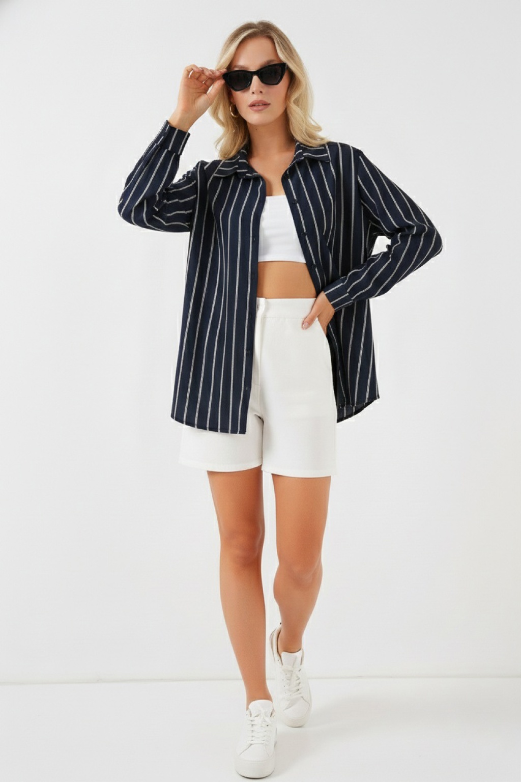 Kadın Çizgili Oversize Gömlek 20293 - Lacivert
