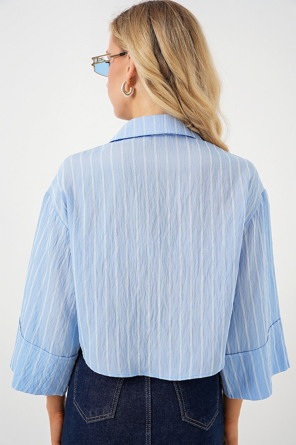 Kadın Çizgili Oversize Kısa Gömlek 20326 - Mavi