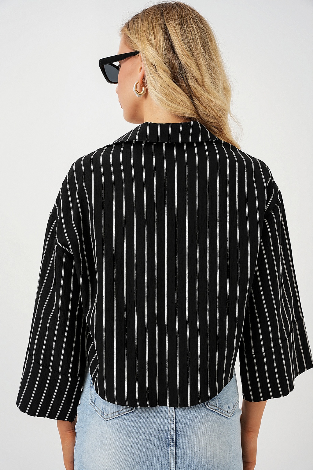 Kadın Çizgili Oversize Kısa Gömlek 20326 - Siyah