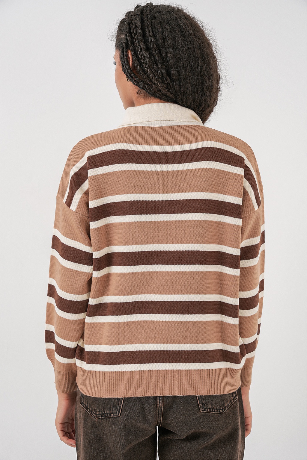 Kadın Çizgili Polo Yaka Triko Kazak 15952 - Vizon