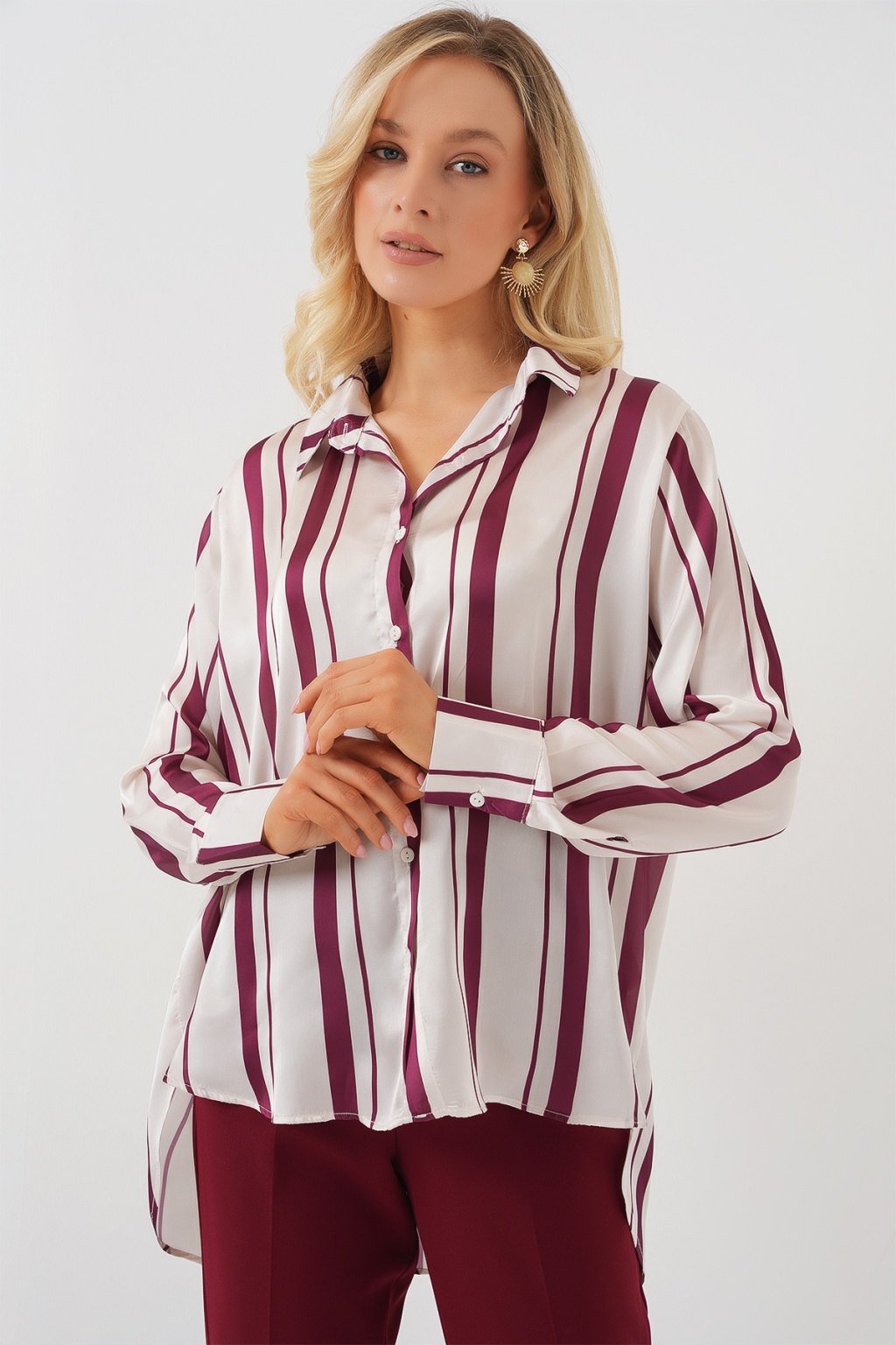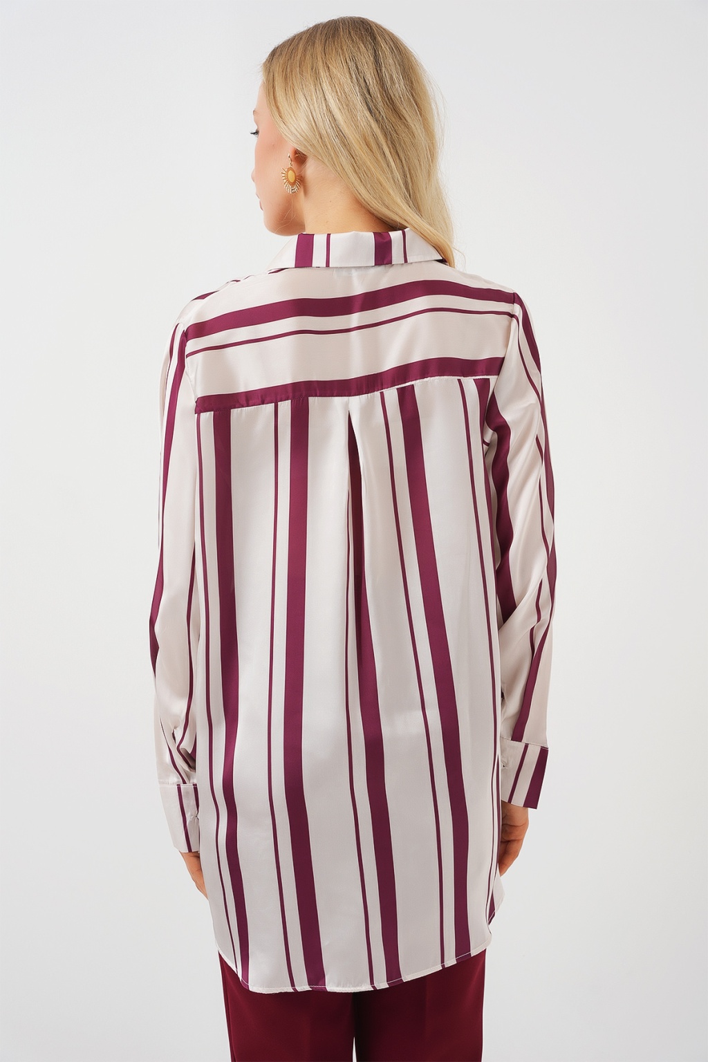 Kadın Çizgili Uzun Saten Gömlek 20291 - Bordo
