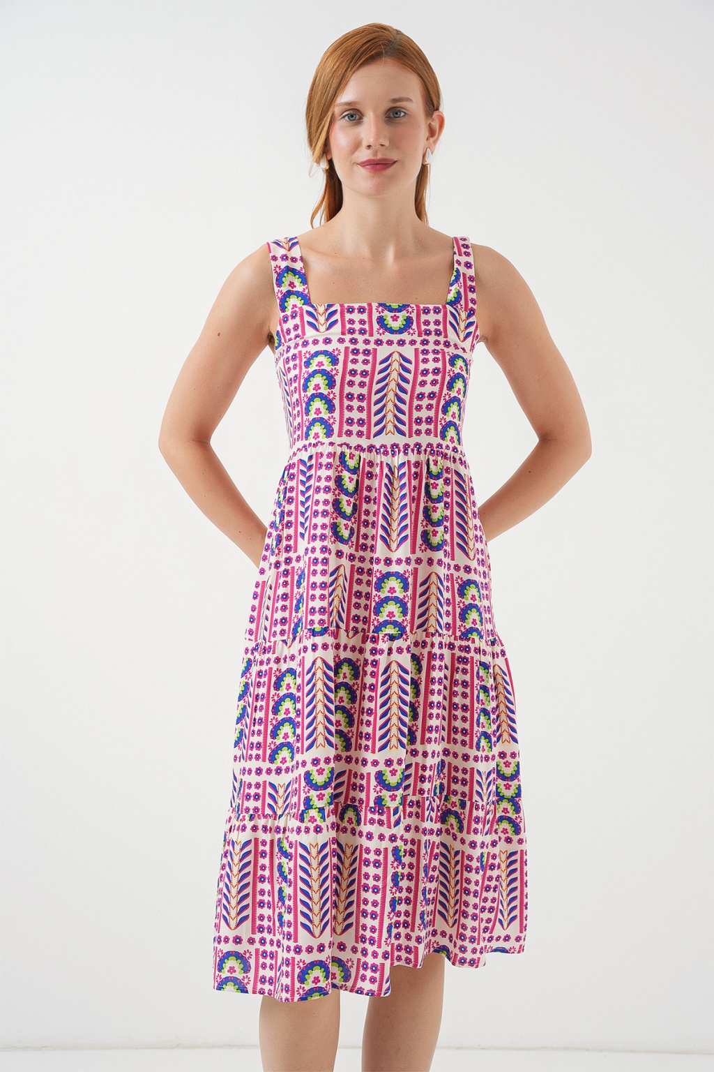 Kadın Desenli Askılı Midi Elbise 2577 - Fuşya