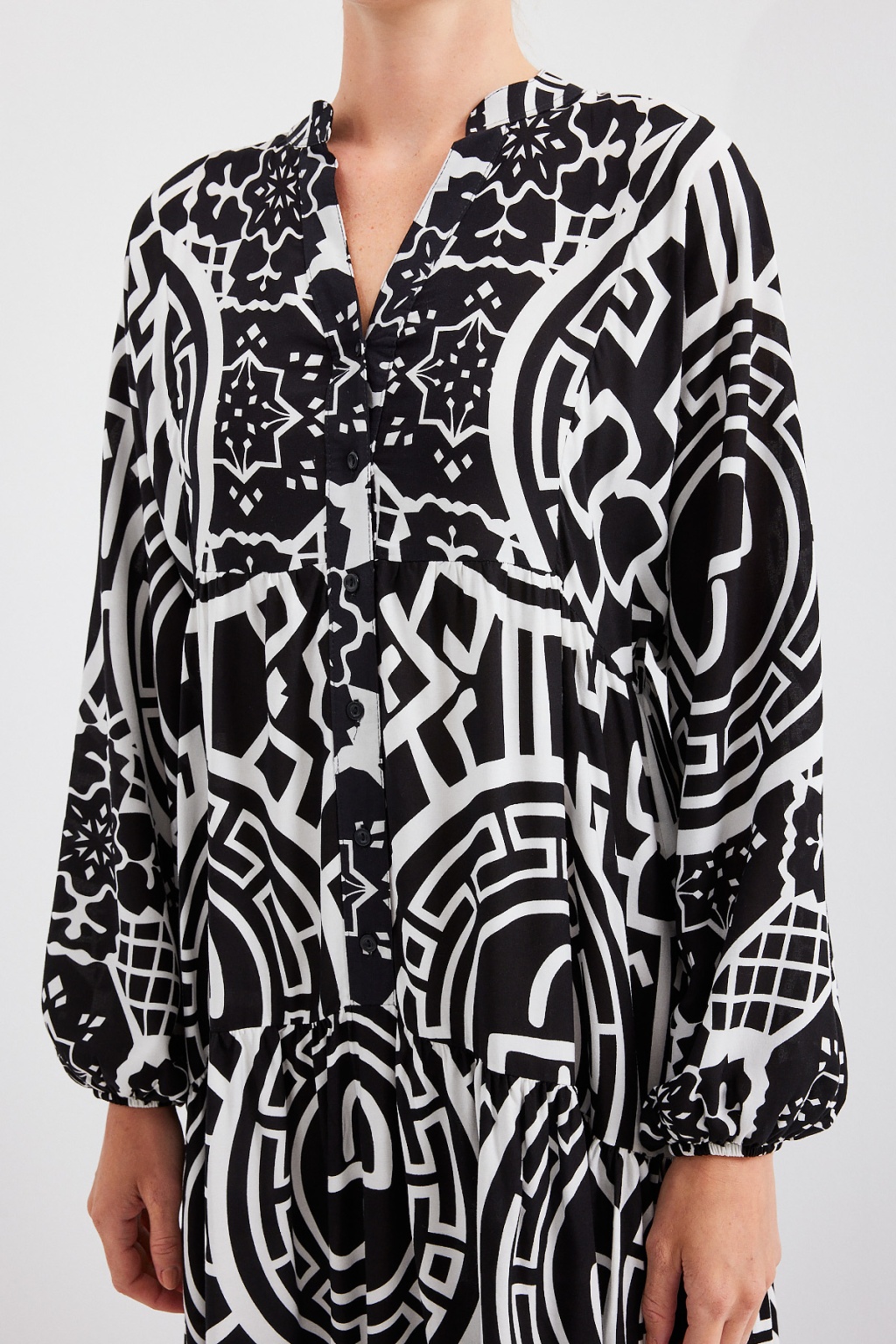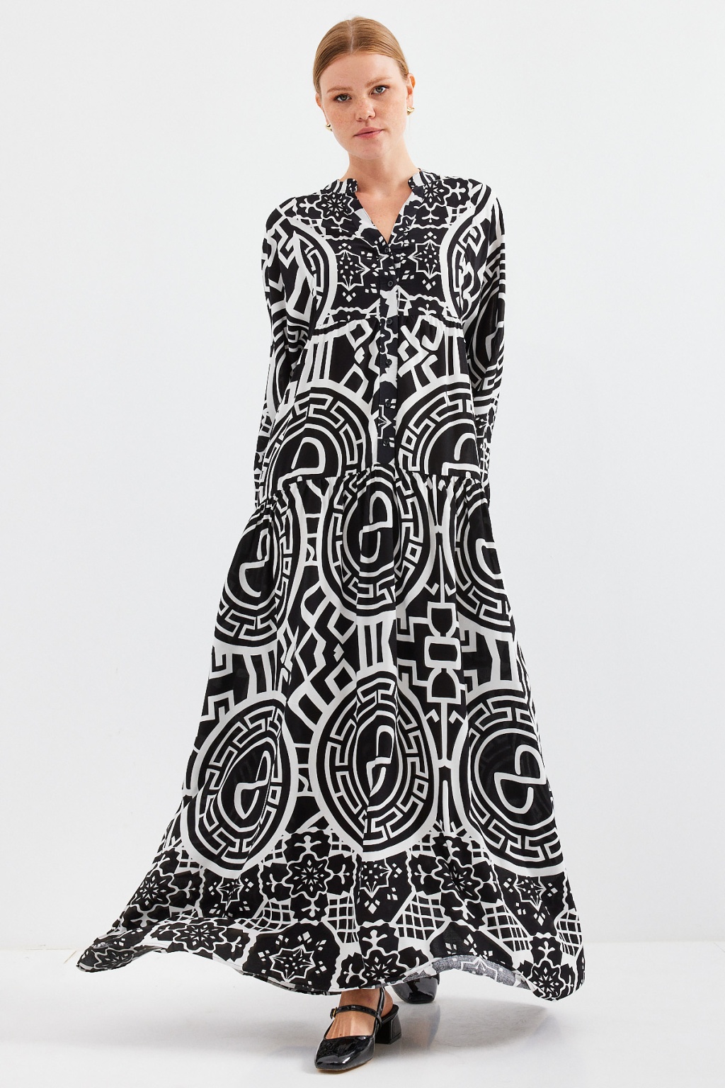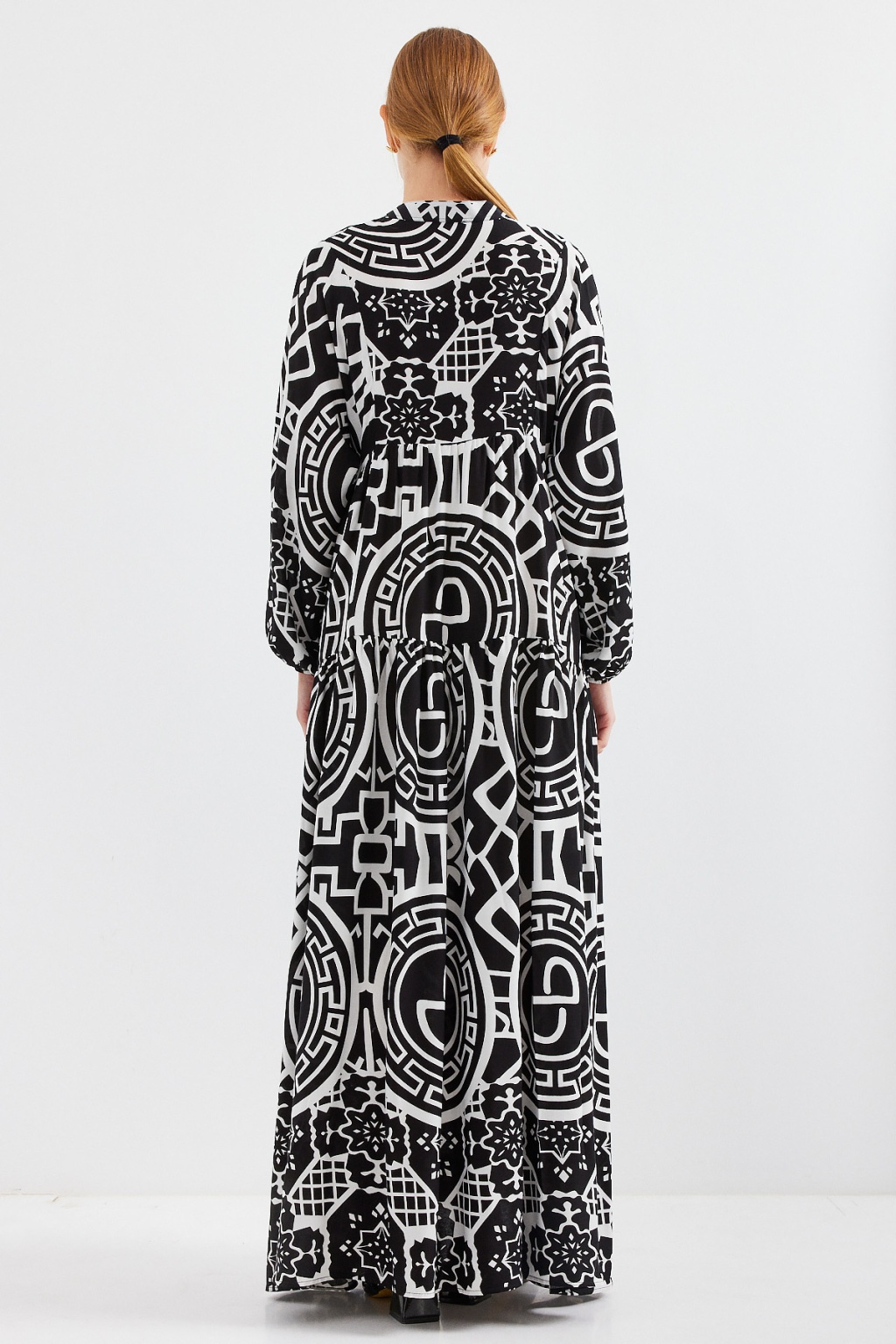 Kadın Desenli Siyah Beyaz Viskon Tesettür Elbise 2423
