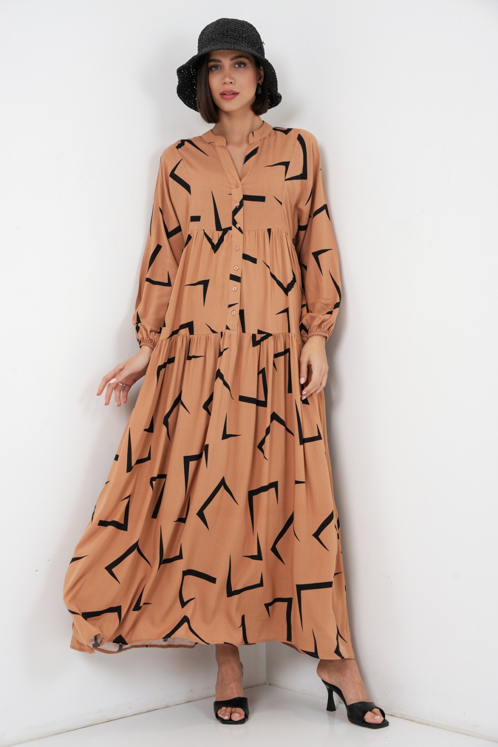 Kadın Desenli Uzun Tesettür Elbise 2585 - A. Vizon
