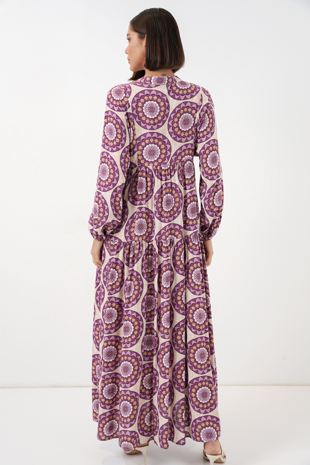 Kadın Desenli Uzun Tesettür Elbise 2585 - B.Lila