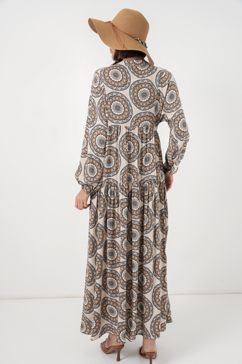 Kadın Desenli Uzun Tesettür Elbise 2585 - C. Bej