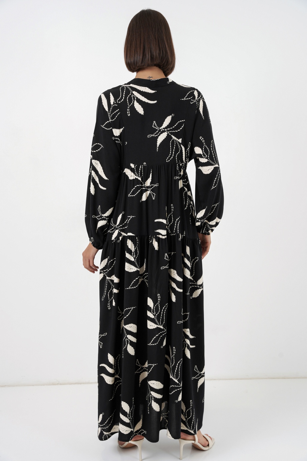 Kadın Desenli Uzun Tesettür Elbise 2585 - Y.Siyah