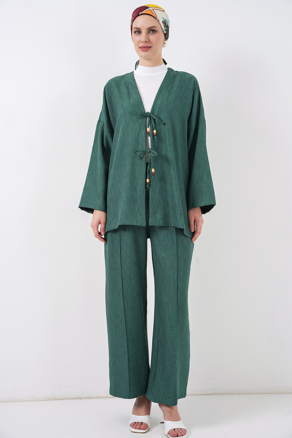 Kadın Keten Kimono İkili Takım 6727 - Zümrüt Yeşili
