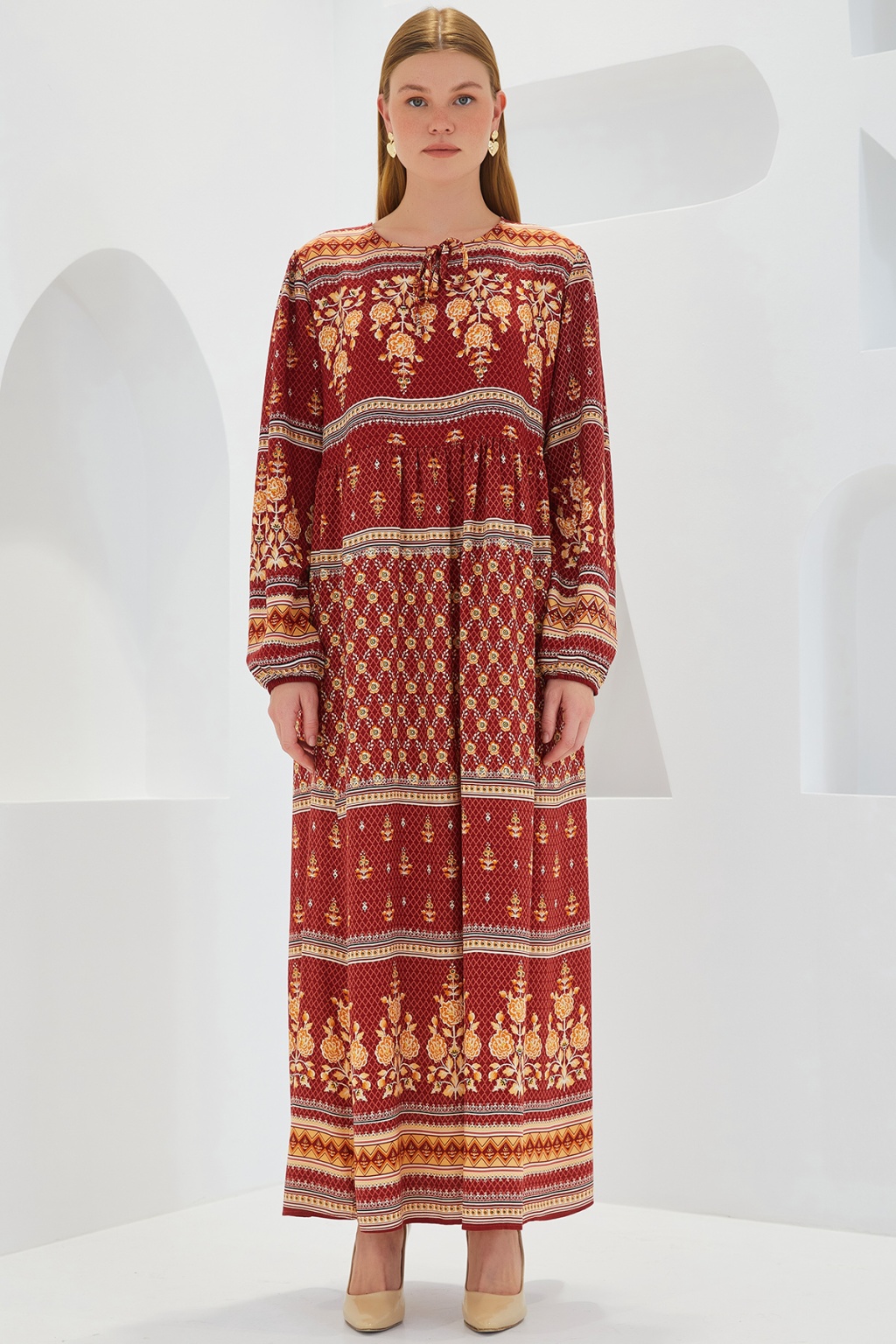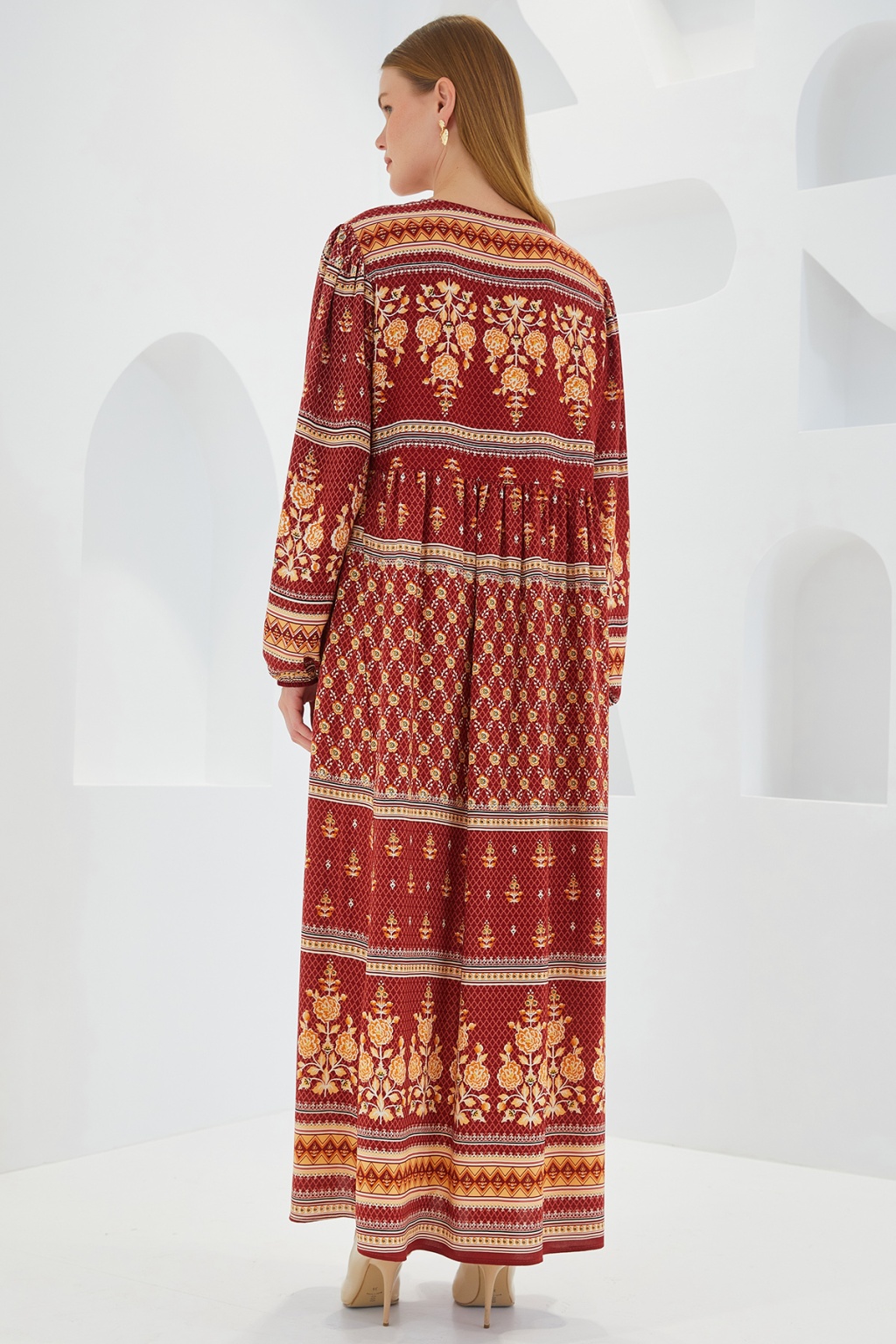 Kadın Kiremit Bej Desenli Uzun Viskon Elbise 1947