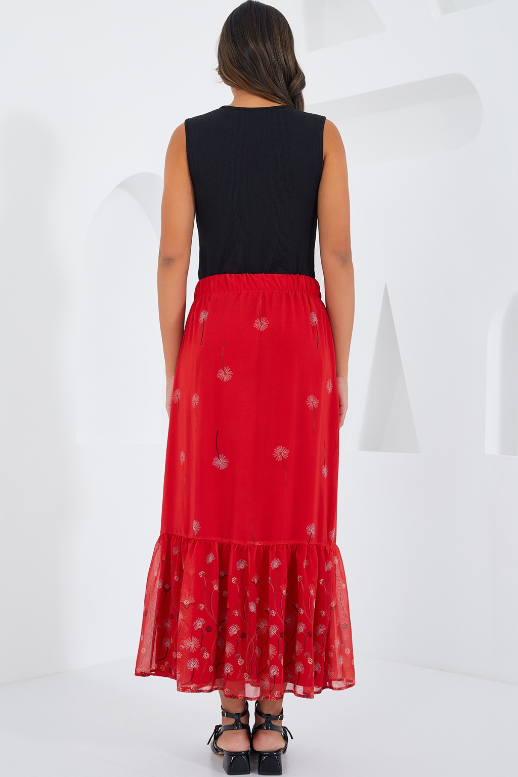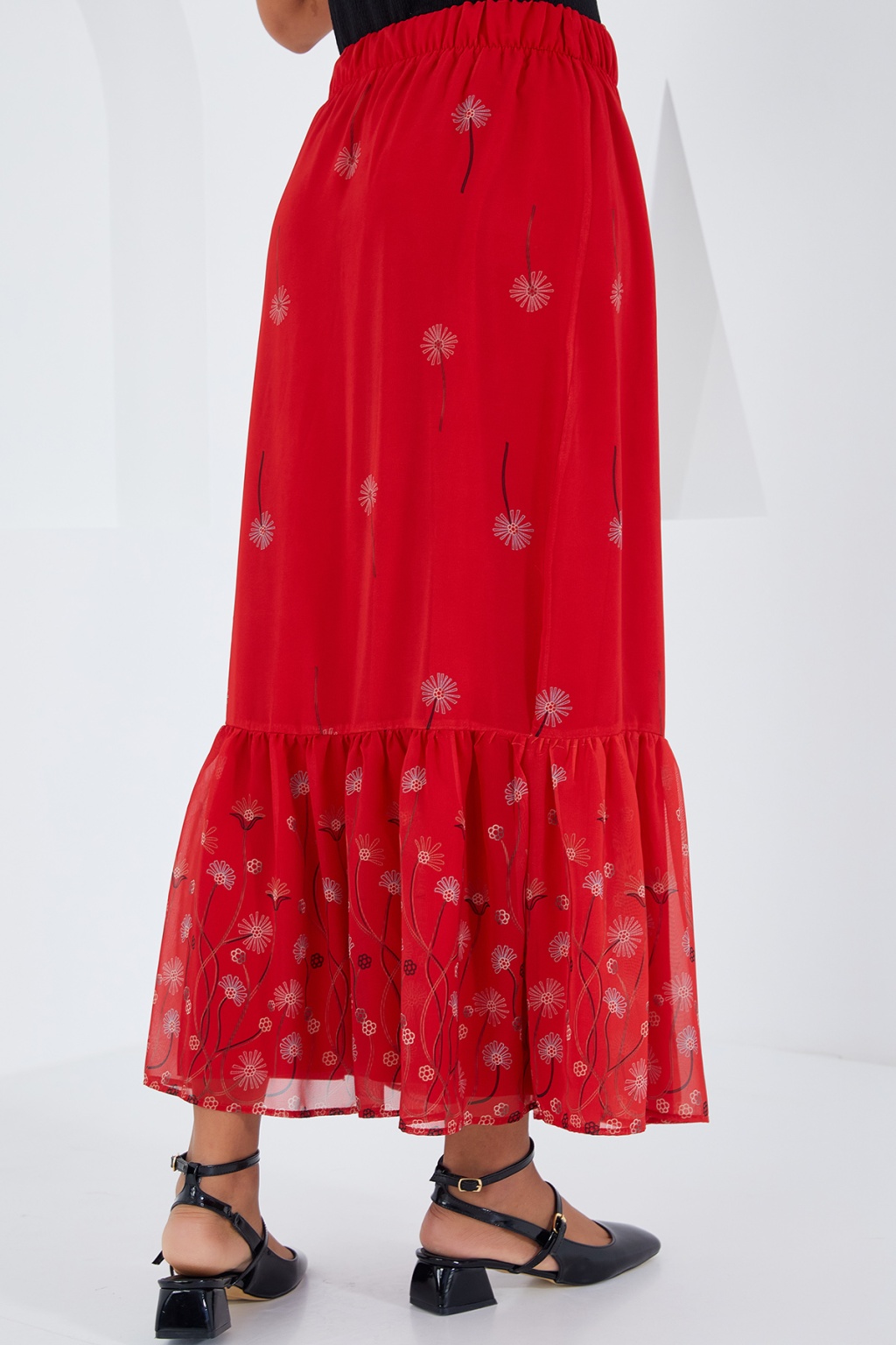 Kadın Kırmızı Desenli Şifon Etek 8010