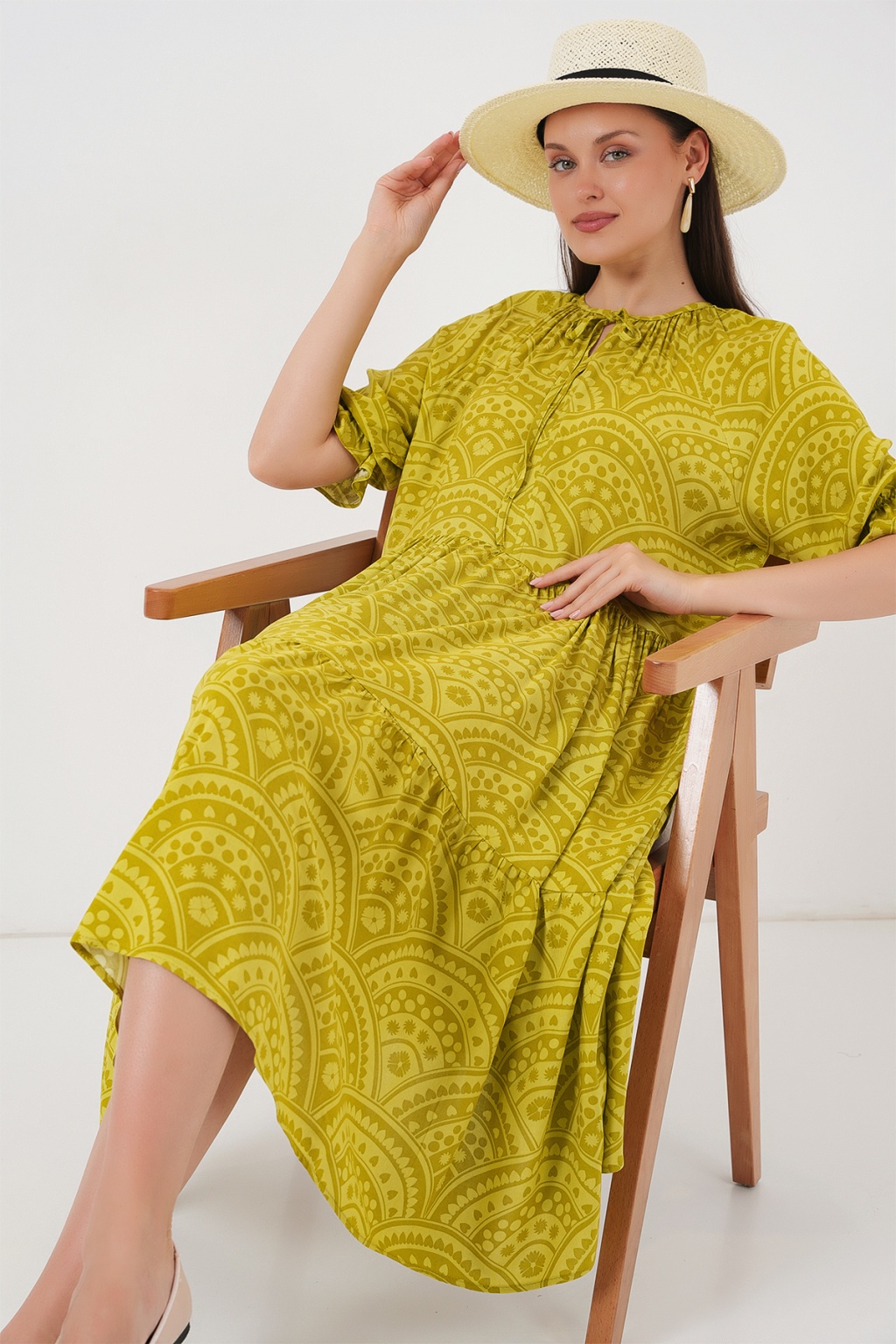 Kadın Kısa Kol Desenli Elbise 2553 - E.Yeşil