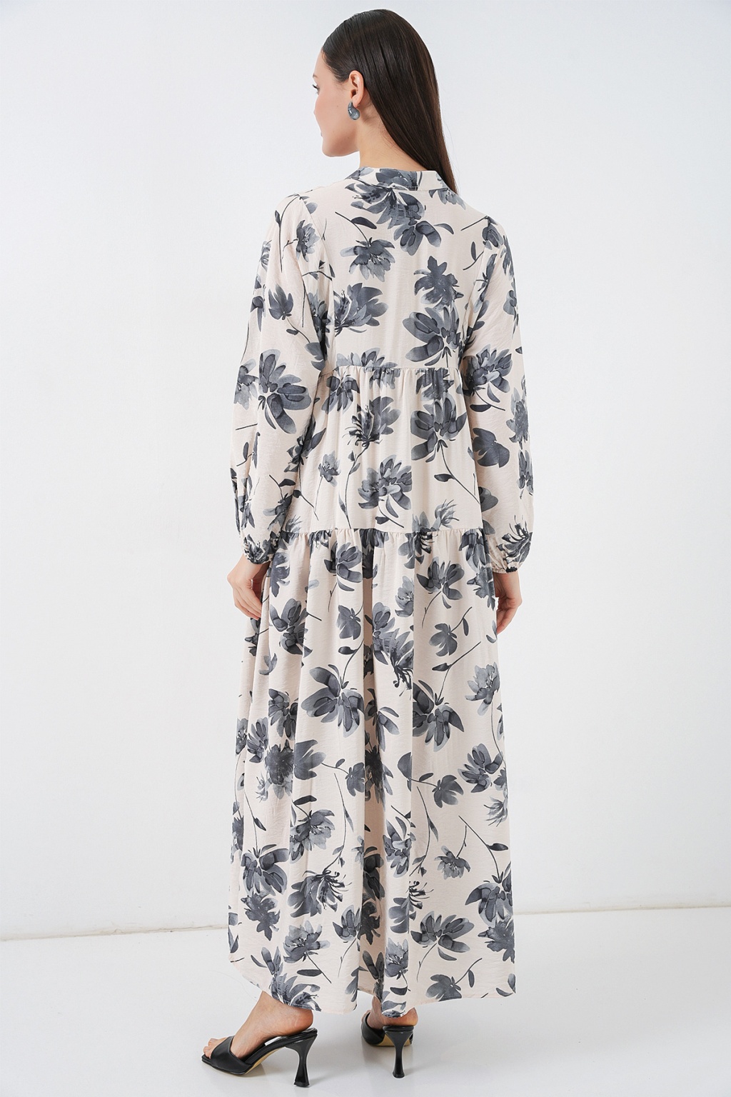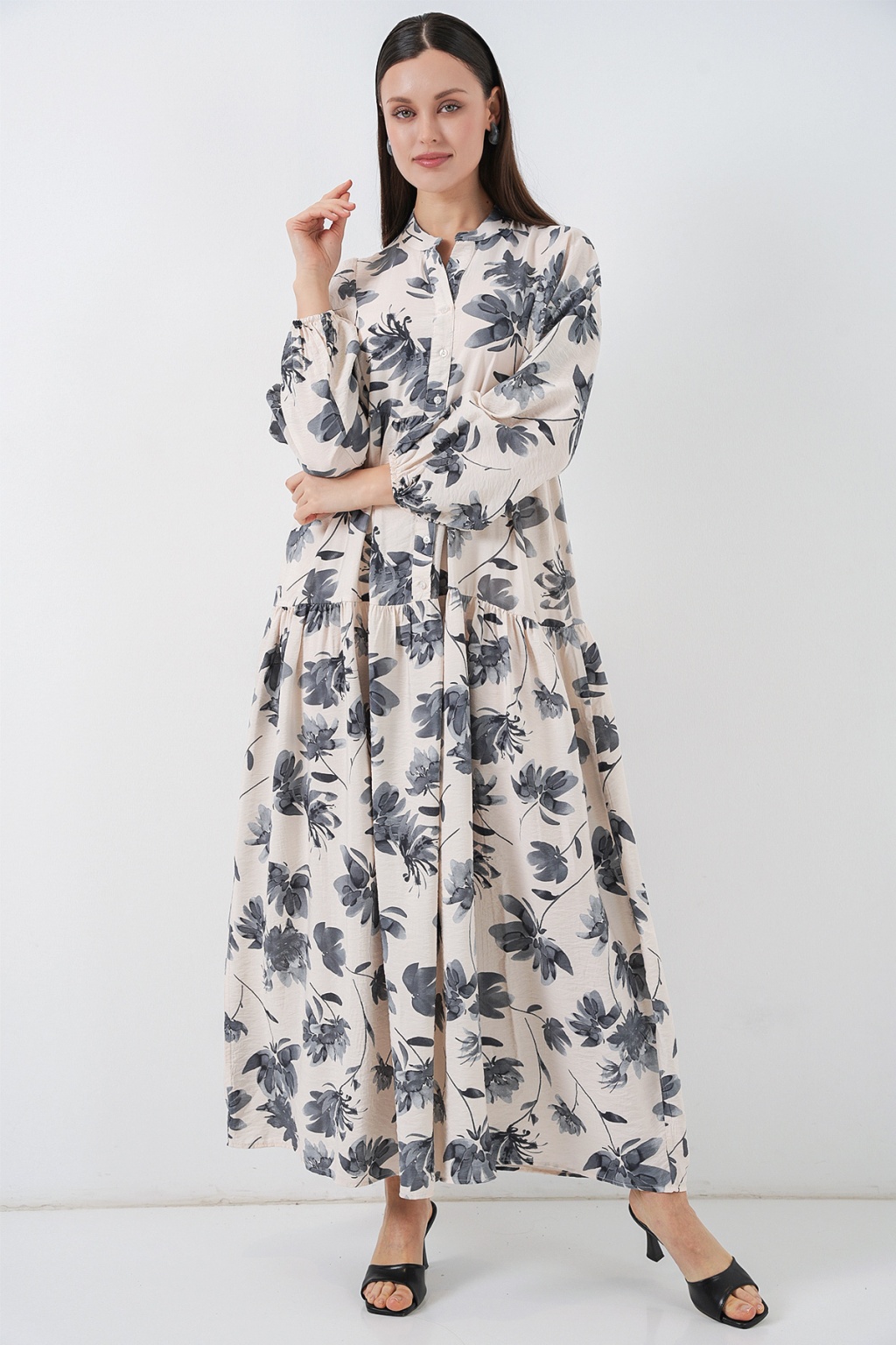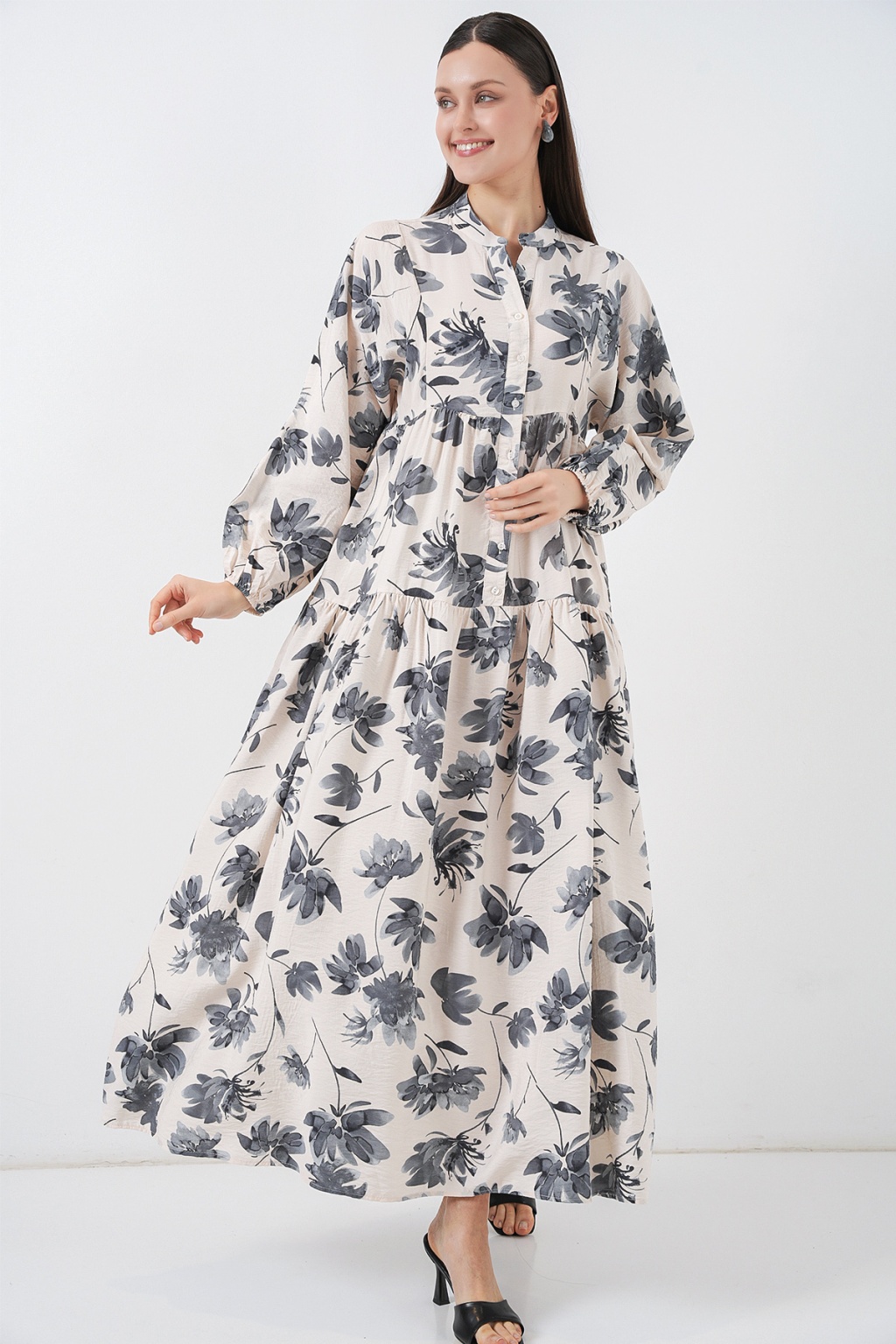 Kadın Lilyum Kumaş Uzun Tesettür Elbise 2593 - Gri