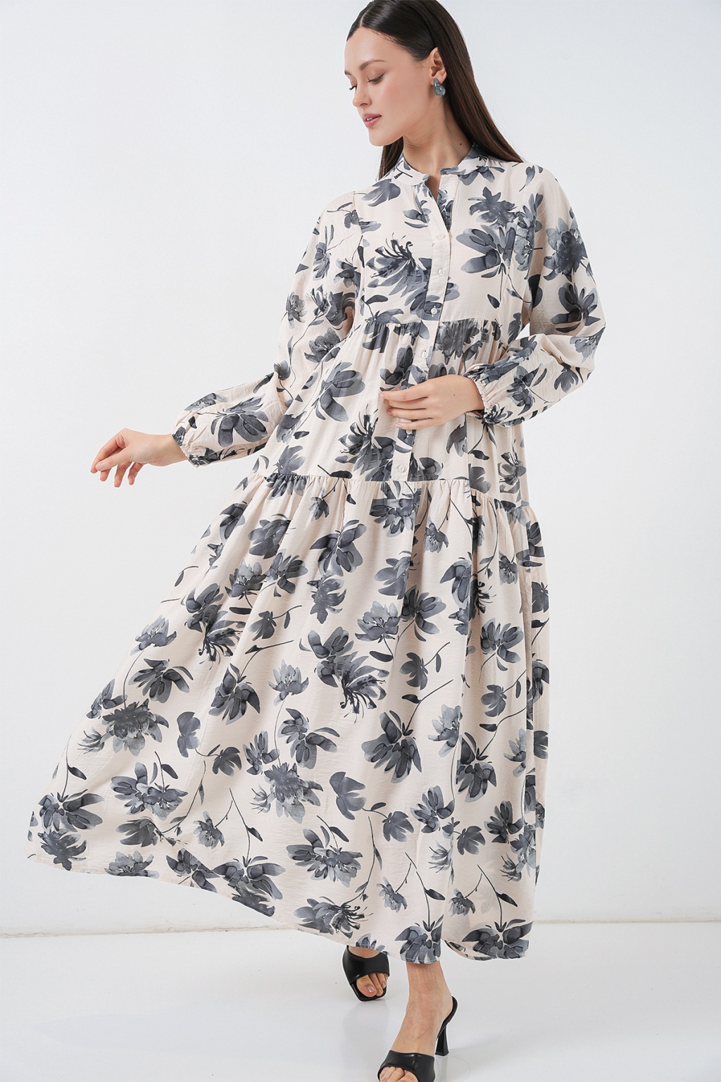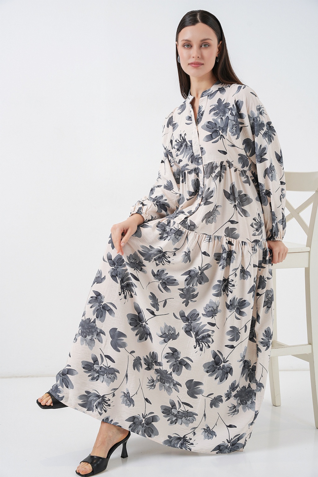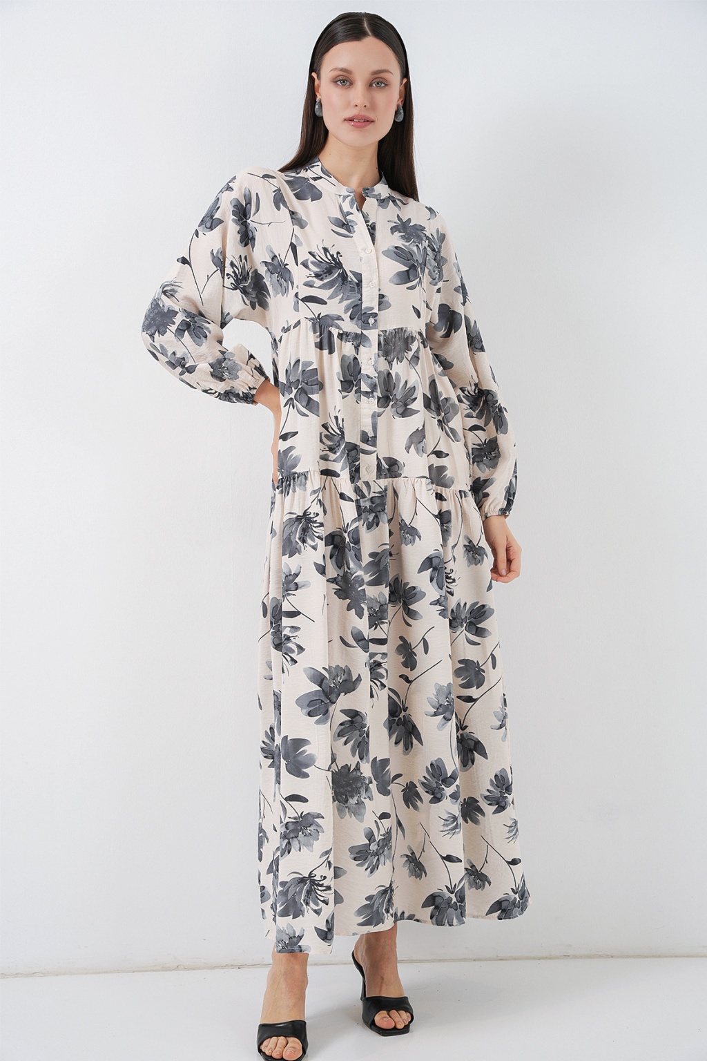 Kadın Lilyum Kumaş Uzun Tesettür Elbise 2593 - Gri