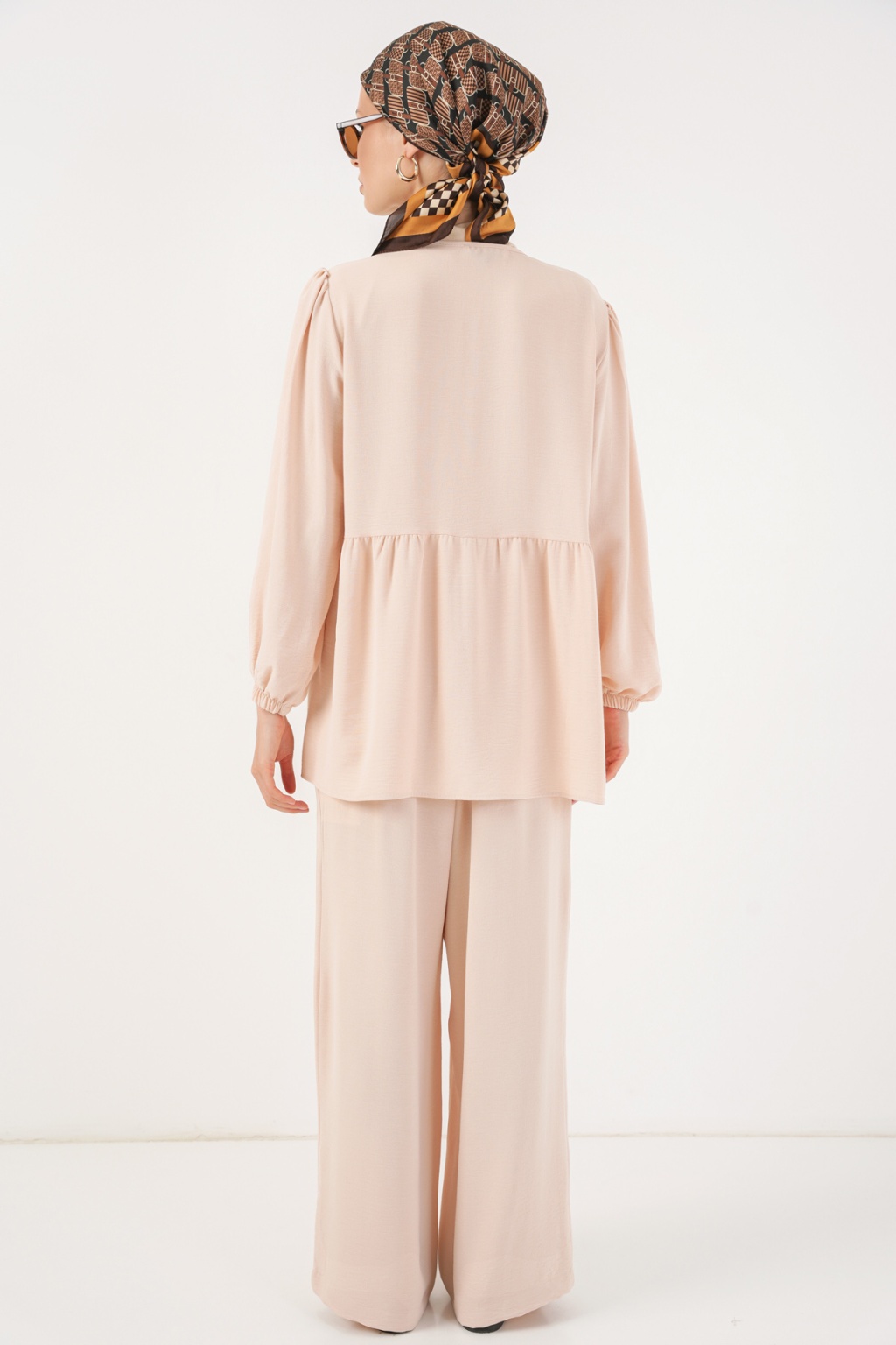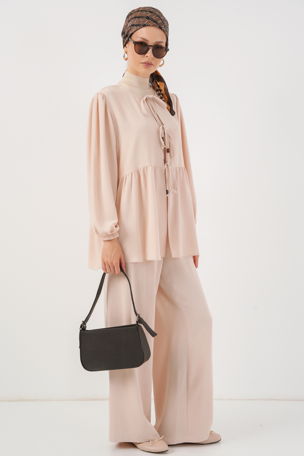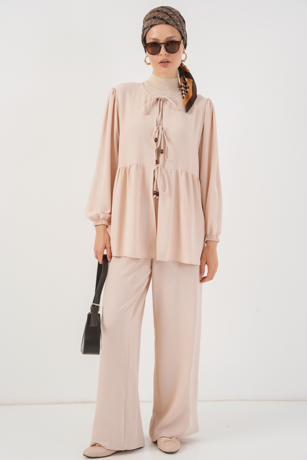 Kadın Önü Bağcıklı Tunik Pantolon İkili Takım 6744 - Krem