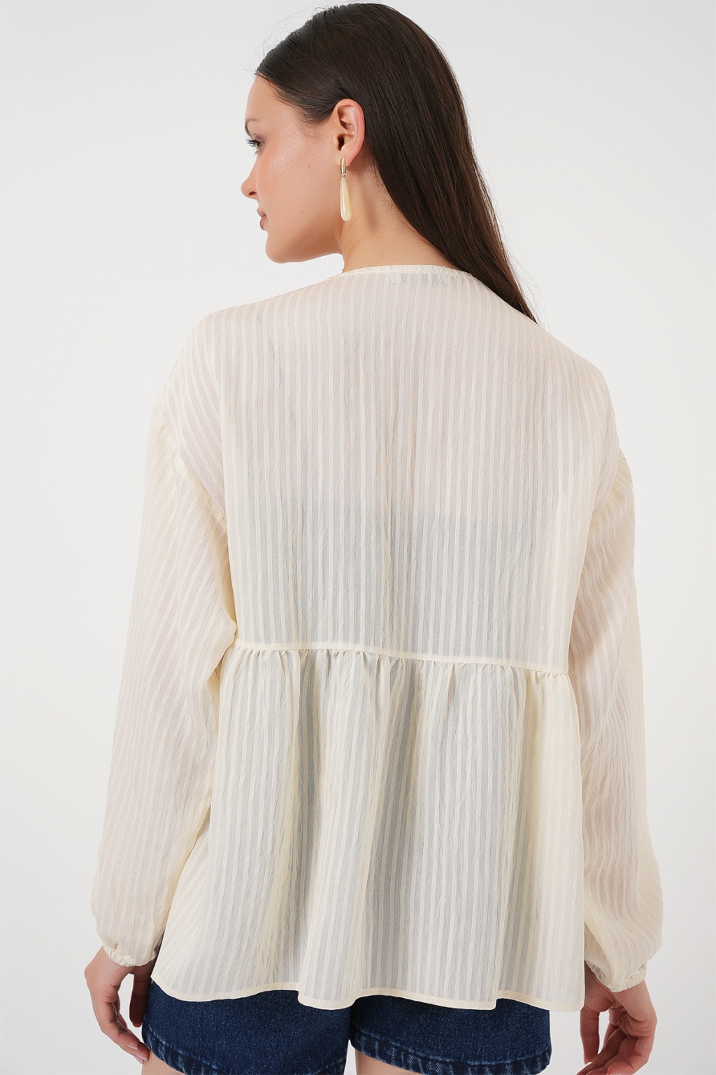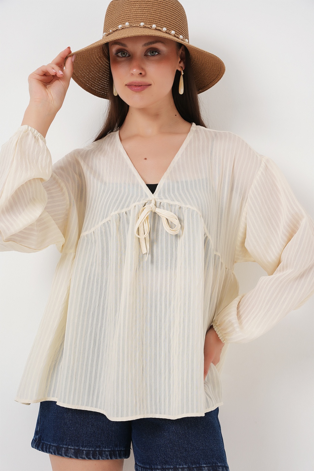 Kadın Önü Bağcıklı Uzun Kol Bluz 946 - Krem