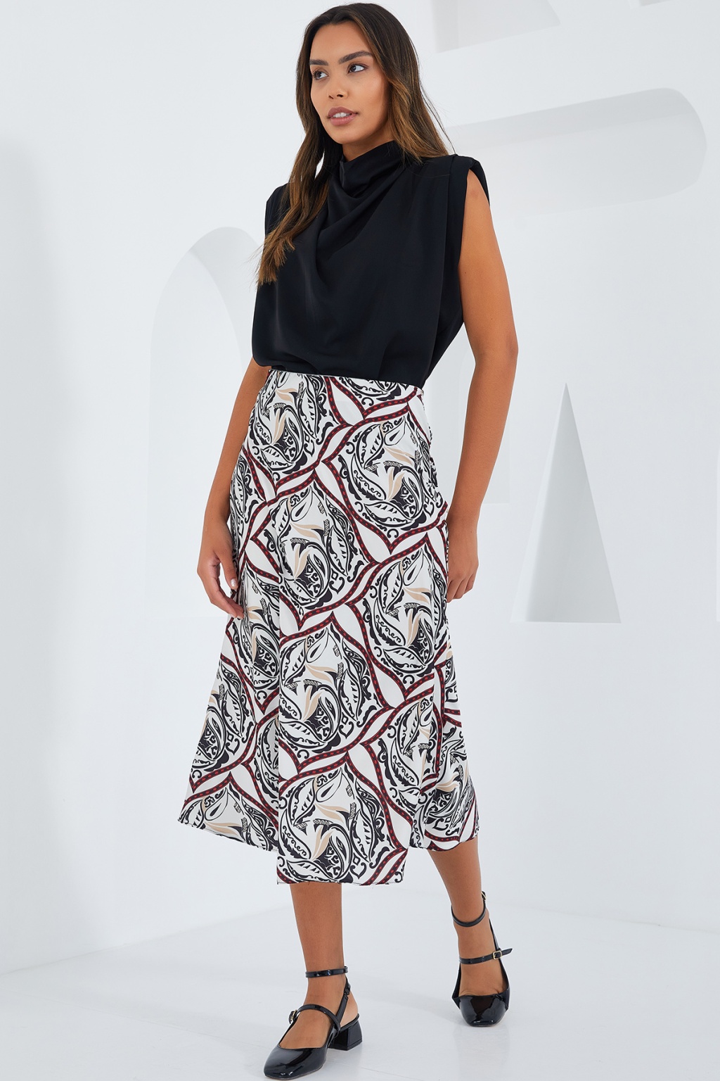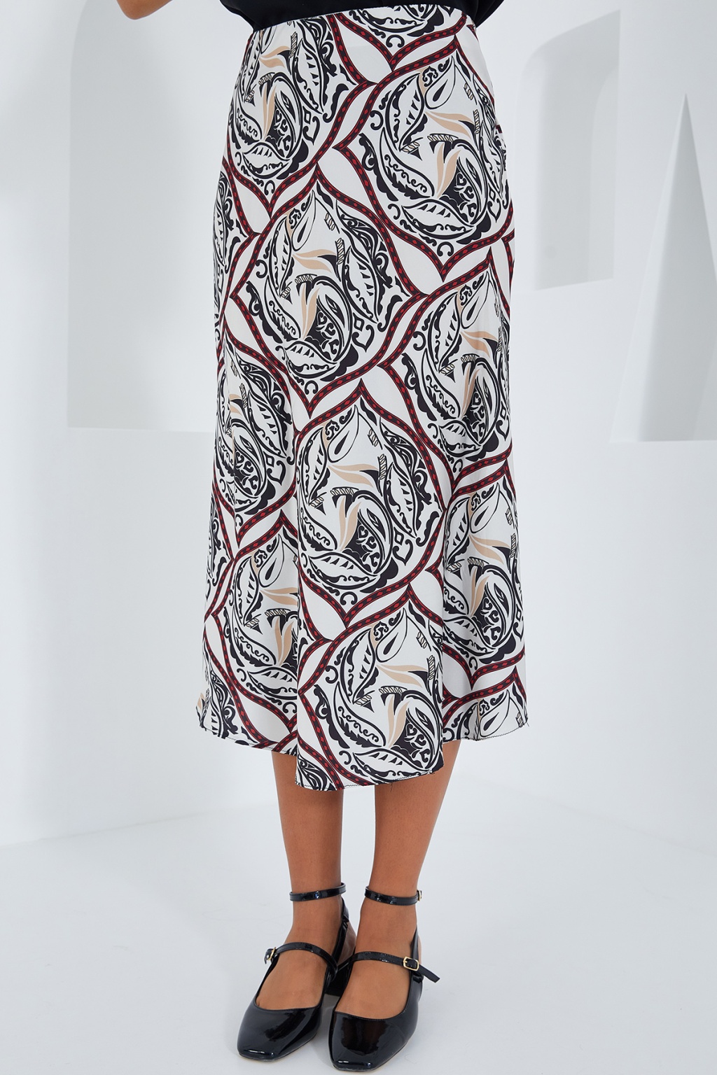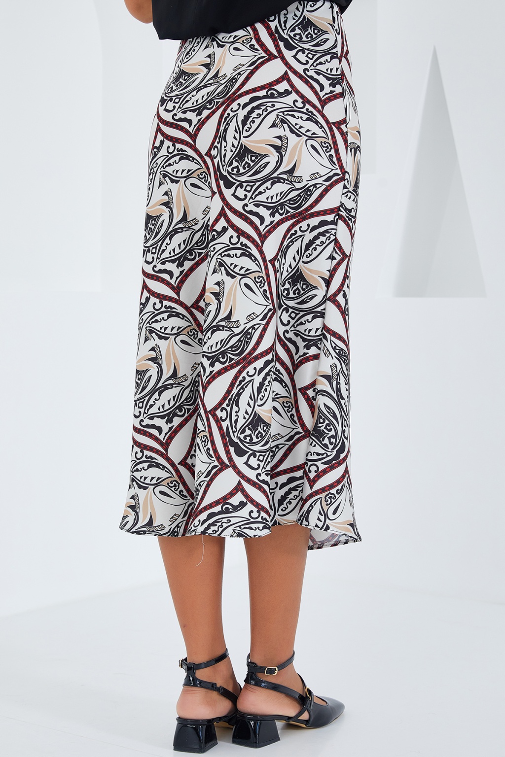 Kadın Siyah Kırmızı Desenli Saten Etek 15806