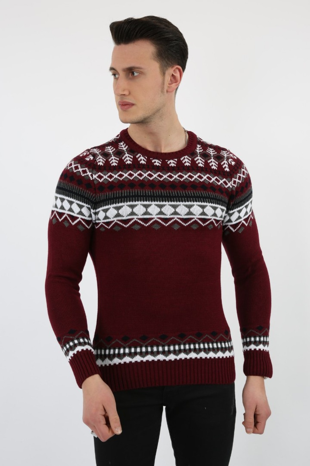 Karışık Desenli Bordo Kalın Kışlık Günlük Triko Kazak