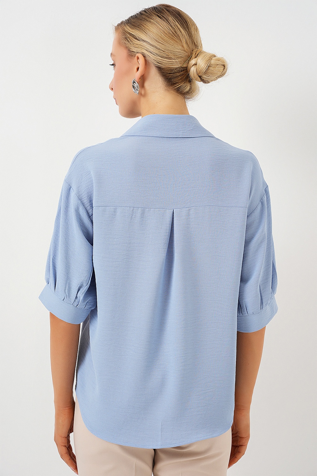 Kısa Kol Oversize Keten Gömlek 20240 - B.Mavi