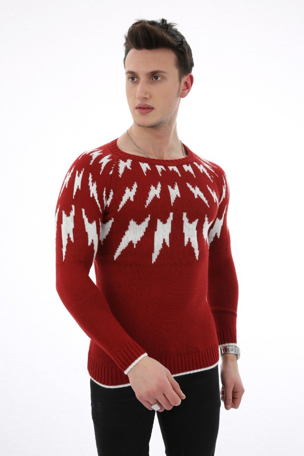 Şimşek Desenli Kırmızı Kalın Kışlık Günlük Triko Kazak