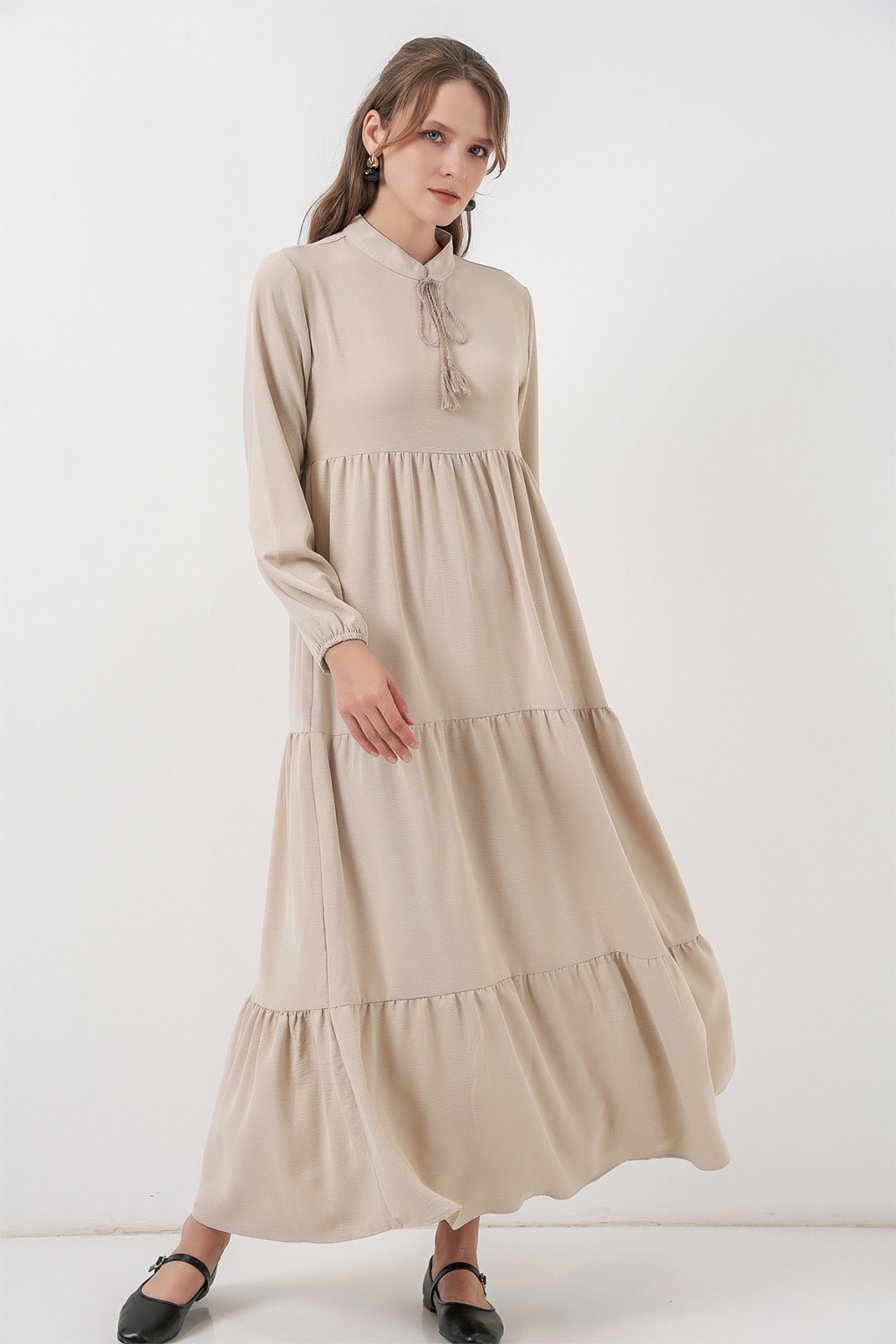 T1627 Yaka Bağcıklı Elbise - Taş